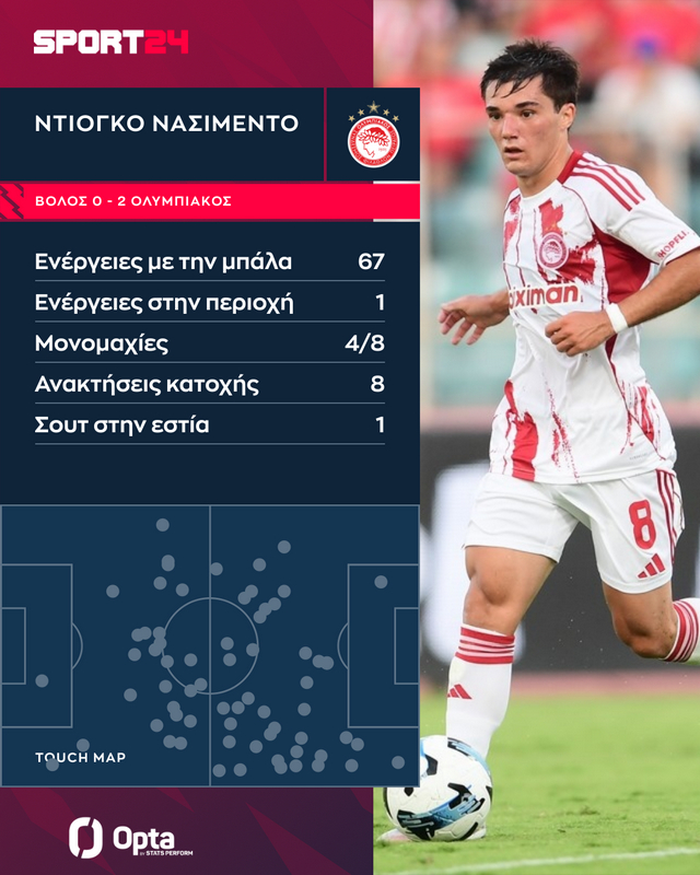 Στα 89 λεπτά που αγωνίστηκε, πριν αφήσει τη θέση του στον Λορέντσο Σιπιόνι που έκανε το ντεμπούτο του με τους νταμπλούχους Ελλάδας, ο Ντιόγκο Νασιμέντο είχε συνολικά 67 ενέργειες με την μπάλα.