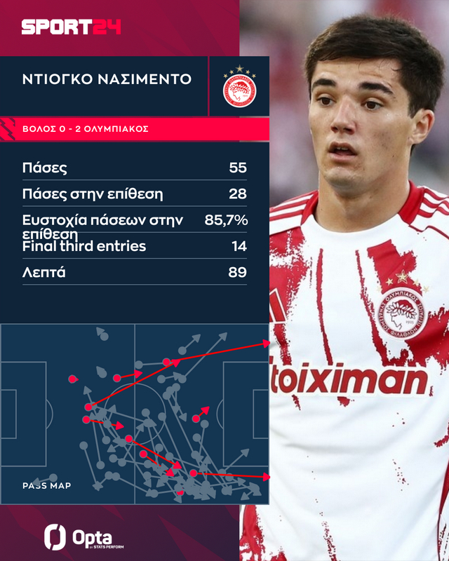 Παράλληλα, ο Ντιόγκο Νασιμέντο, ένας ποδοσφαιριστής που αποκτήθηκε φέτος το καλοκαίρι από τους ερυθρόλευκους, αντί 4.000.000 ευρώ από τη Βιζέλα, ήταν και ο παίκτης με τις περισσότερες Final Third Entries στο ματς, δηλαδή τις περισσότερες φορές που έφερε την μπάλα στο τελευταίο τρίτο του γηπέδου, με 14.