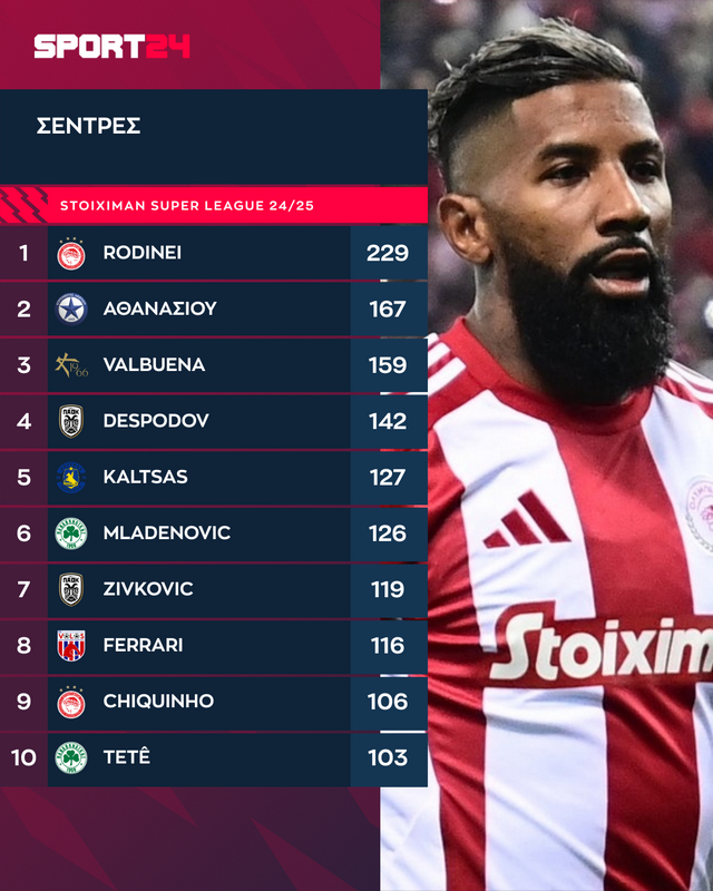 Επιστρέφοντας στην Stoiximan Super League, ο Ροντινέι είναι πρώτος σε επιτυχημένες σέντρες με 63, πρώτος σε σέντρες στο open play με 156, αλλά και σε επιτυχημένες σέντρες στο open play με 33.