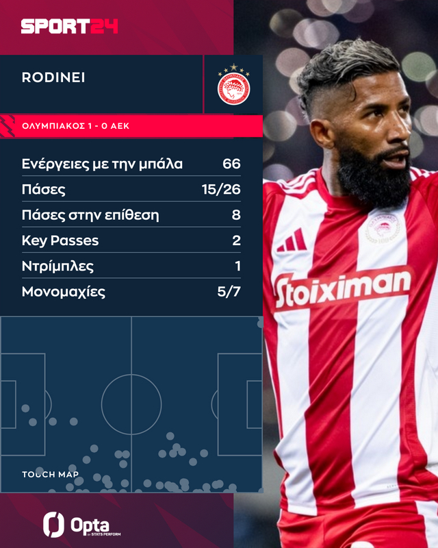 Ο Ροντινέι ήταν ο ποδοσφαιριστής με τις περισσότερες ενέργειες με την μπάλα στο παιχνίδι, με 66, έχοντας “πατήματα” σε κάθε ύψος της δεξιάς πτέρυγας των Πειραιωτών. Είχε 15 επιτυχημένες μεταβιβάσεις στις 26 που επιχείρησε, με το ποσοστό ευστοχίας του να αγγίζει το 58%, ενώ συνέβαλε και στην προώθηση του παιχνιδιού για την ομάδα του Μεντιλίμπαρ μετρώντας 8 πάσες στην επίθεση.