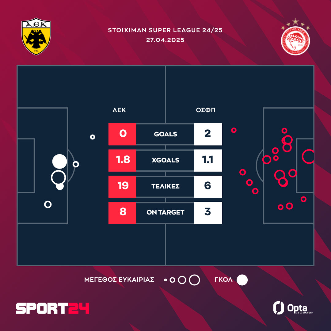 Ολυμπιακός: Οι τελικές της ΑΕΚ ήταν περισσότερες απ’ όσες δέχθηκε ο Ολυμπιακός σε όλα τα playoffs αλλά τη νίκησε με 3 on target σουτ