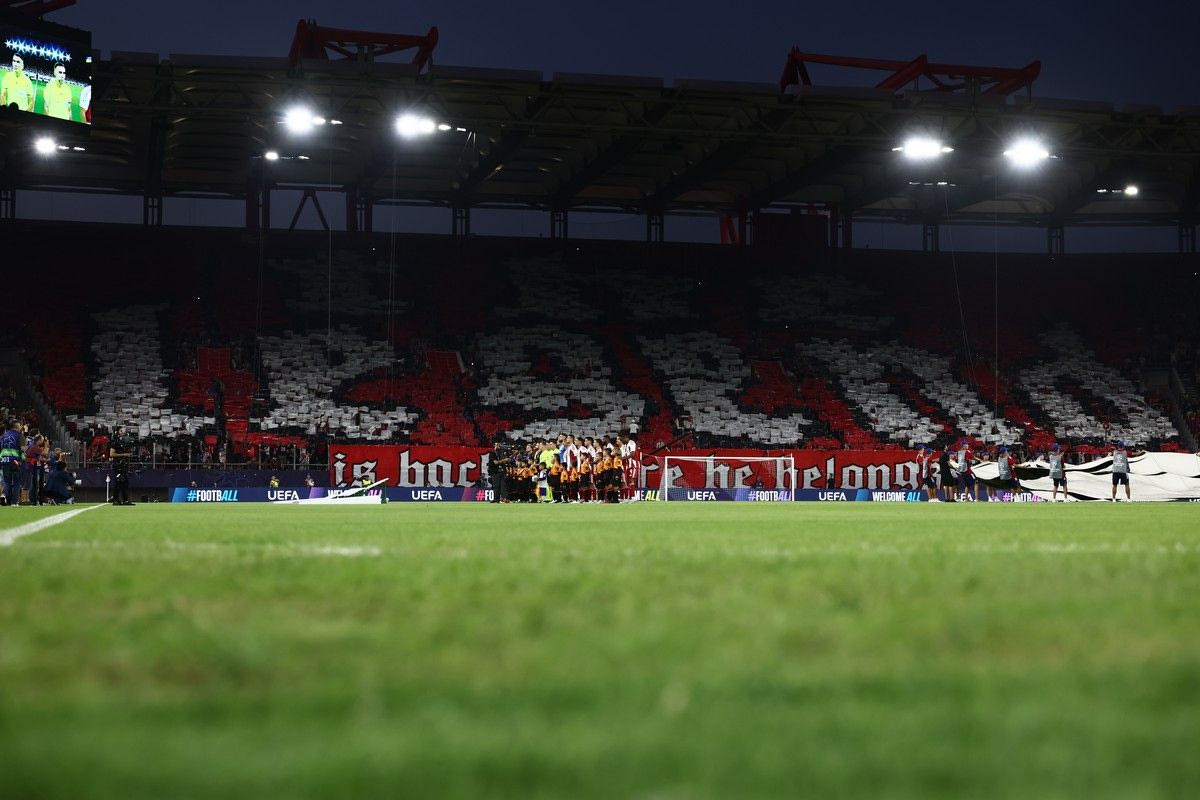 Μερικά δευτερόλεπτα πριν από την έναρξη του αγώνα, οι ερυθρόλευκοι υποδέχθηκαν τους παίκτες των δύο ομάδων με ένα εντυπωσιακό κορεό για την επιστροφή των νταμπλούχων Ελλάδας στην κορυφαία διασυλλογική διοργάνωση.