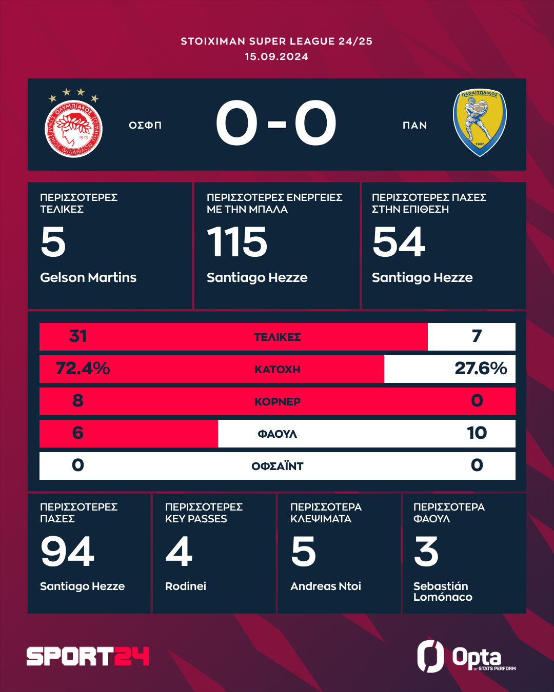 Οι Πειραιώτες πίεσαν μέχρι το τελευταίο λεπτό, όμως οι Αγρινιώτες είχαν ψύχραιμες αντιδράσεις, με τον τερματοφύλακά τους, να επεμβαίνει, όταν χρειαζόταν. Παράλληλα, οι ερυθρόλευκοι δεν εκμεταλλεύτηκαν τις ευκαιρίες που τους παρουσιάστηκαν. Συνολικά είχαν 31 τελικές με 2.3xG, όμως έμειναν μακριά από το γκολ.