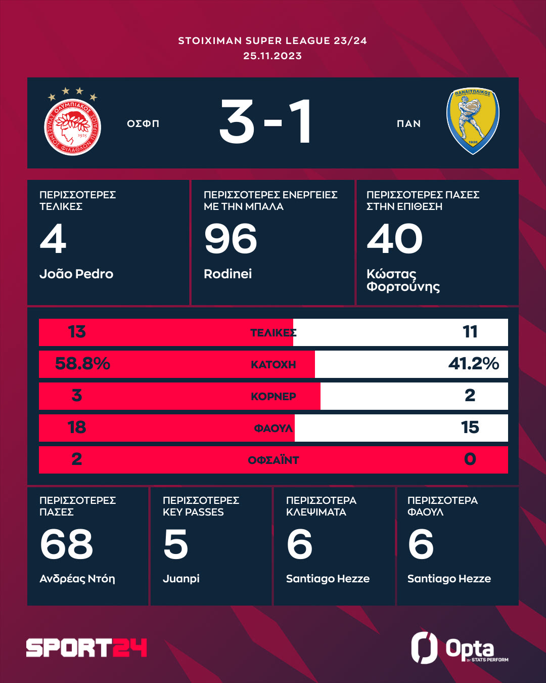 Ο Ολυμπιακός επέστρεψε από την διακοπή λόγω των εθνικών ομάδων με τρίποντο. Οι ερυθρόλευκοι υποδέχθηκαν στο κεκλεισμένων των θυρών εξαιτίας τιμωρίας Καραϊσκάκης τον Παναιτωλικό και επικράτησαν 3-1 των Αγρινιωτών με ανατροπή για την 12η αγωνιστική της Stoiximan Super League.