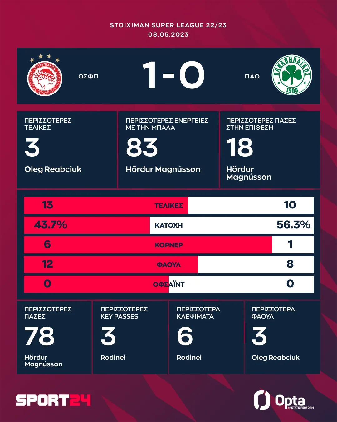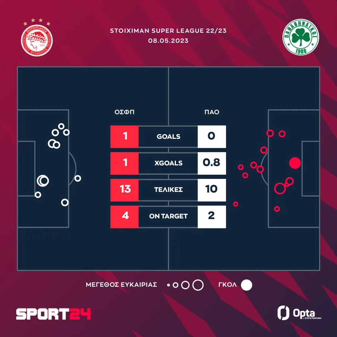 Οι ερυθρόλευκοι ήταν καλύτεροι στη μεγαλύτερη διάρκεια του αγώνα με τον Παναθηναϊκό να απειλεί μετά το γκολ που δέχτηκε, να έχει δοκάρι και ευκαιρίες για να φτάσει στην ισοφάριση καθώς οι πράσινοι πήραν και κάποια ρίσκα αλλά δεν τα κατάφεραν με αποτέλεσμα το παιχνίδι να ολοκληρωθεί με νικητή τον Ολυμπιακό.