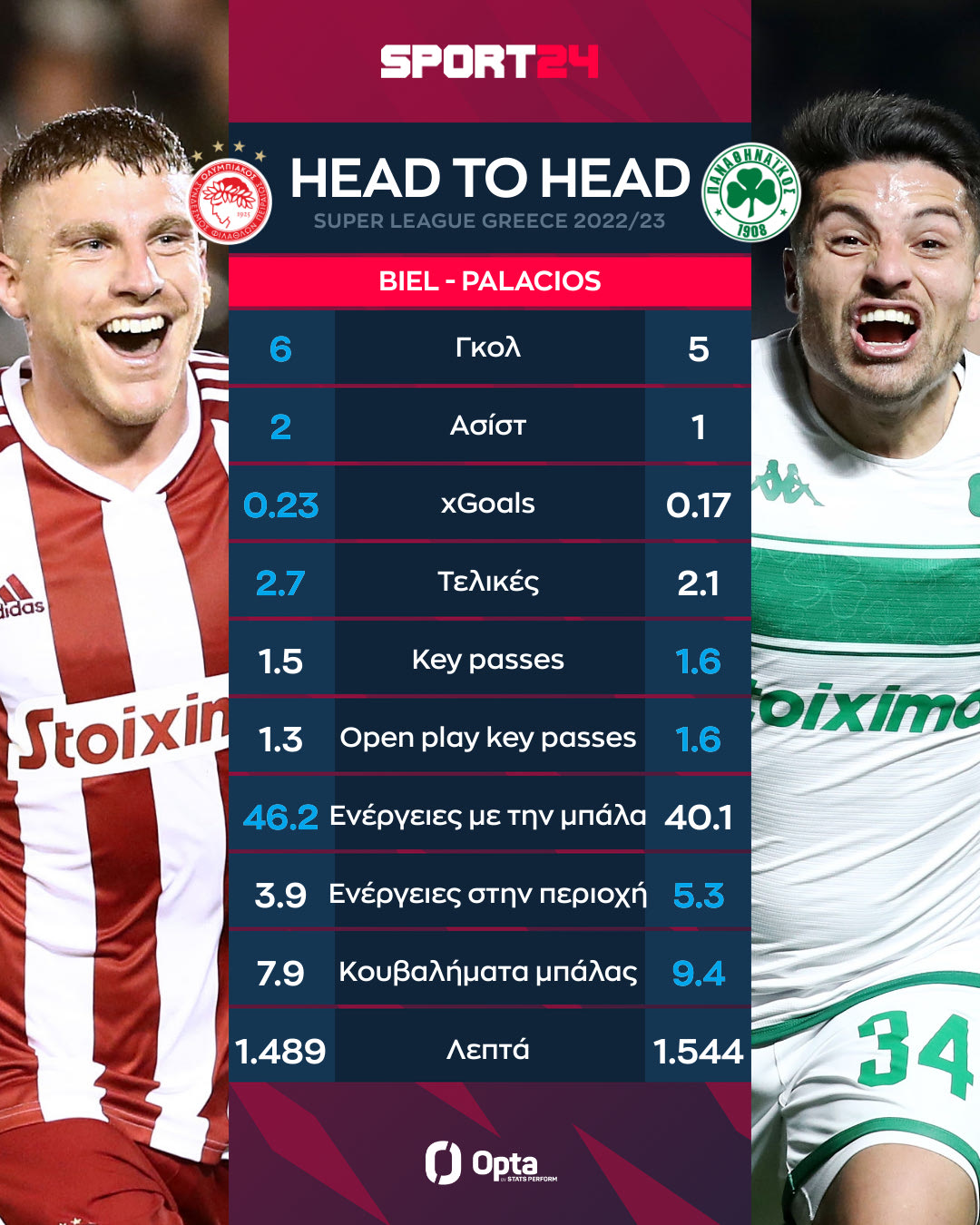 Πάμε, όμως, με τη συμβολή της Opta/Stats Perform να δούμε τη συγκριτικά τους δύο παίκτες και την προσφορά τους σε Ολυμπιακό και Παναθηναϊκό αντίστοιχα.