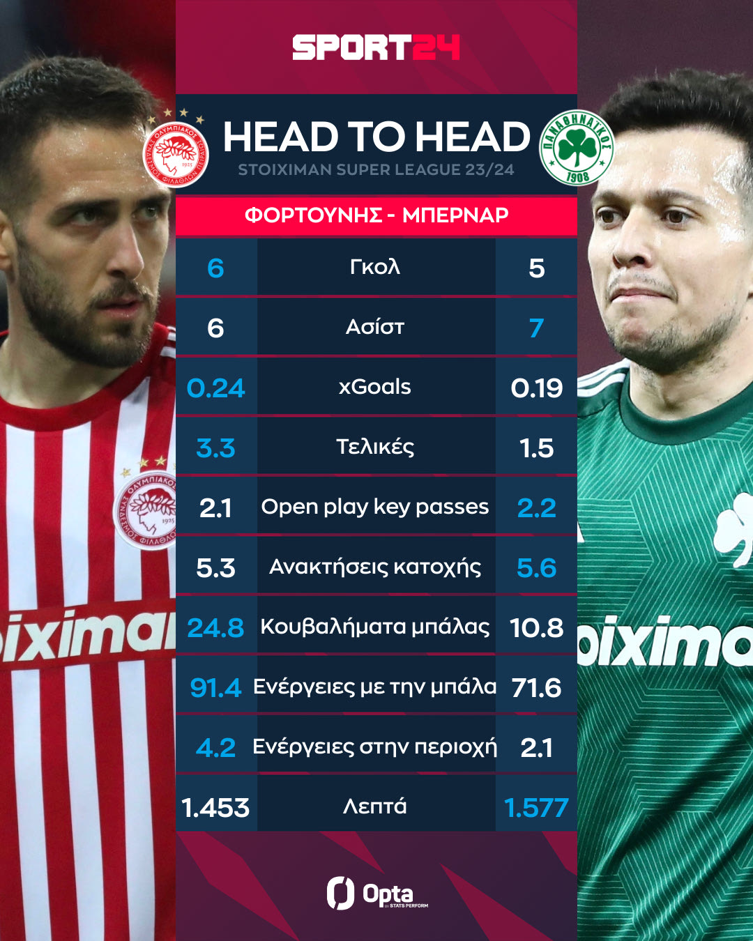 Ολυμπιακός – Παναθηναϊκός: Η ξεκάθαρη υπεροχή του Φορτούνη και η βραχεία κεφαλή του Μπερνάρ