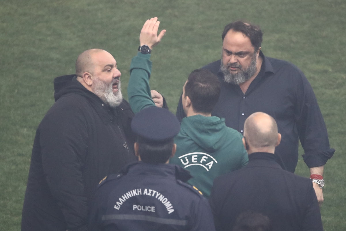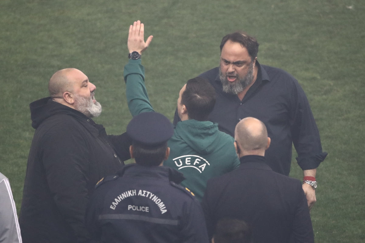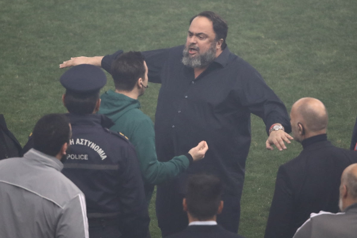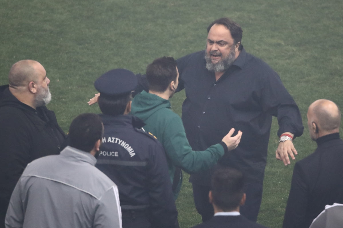 Ολυμπιακός – Παναθηναϊκός: Ο Μαρινάκης κατέβηκε στον αγωνιστικό χώρο και διαμαρτυρήθηκε στον διαιτητή, κίτρινη κάρτα τού έδειξε ο Πορτογάλος