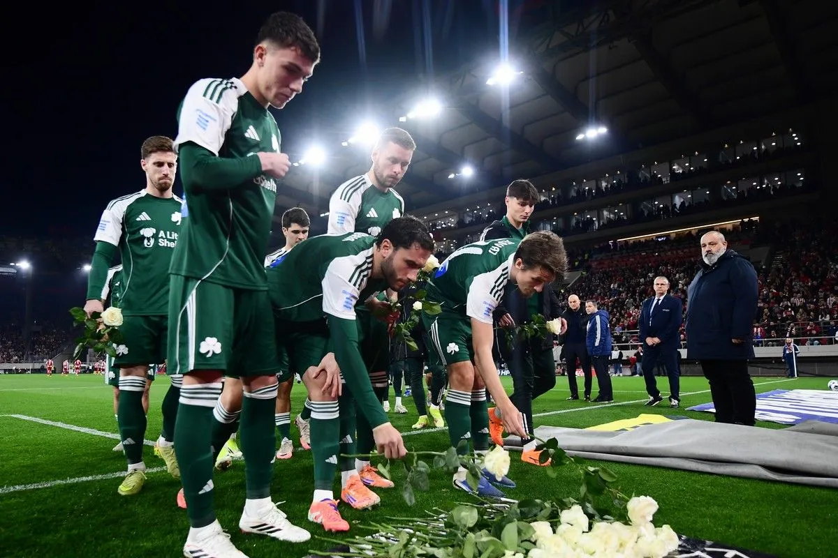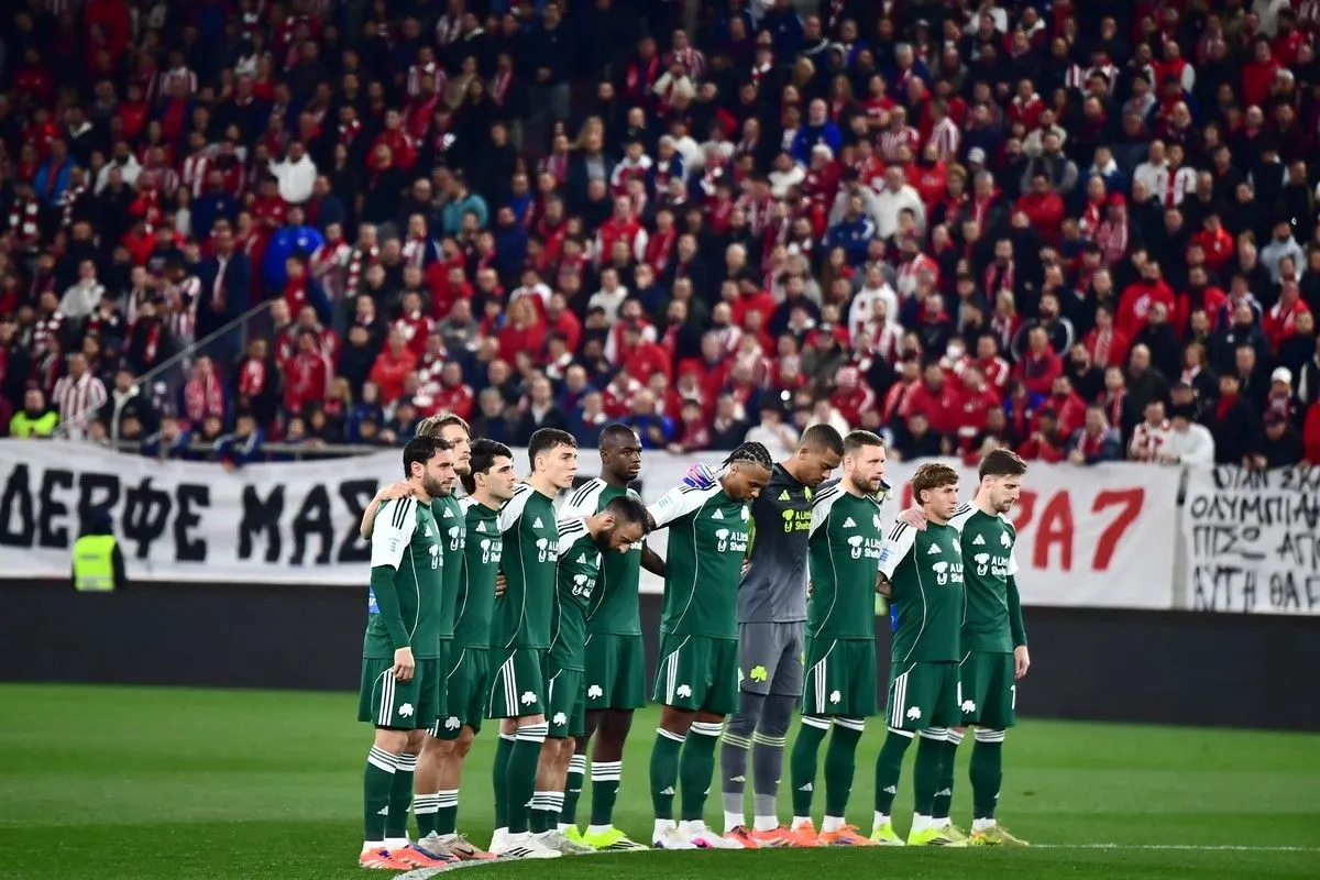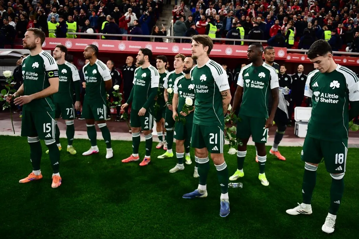 Πριν από τη σέντρα στο Καραϊσκάκης μεταξύ Oλυμπιακού και Παναθηναϊκού, οι παίκτες των πράσινων άφησαν από ένα λευκό τριαντάφυλλο στη Θύρα 7 στη μνήμη των 21 θυμάτων των ερυθρολεύκων.