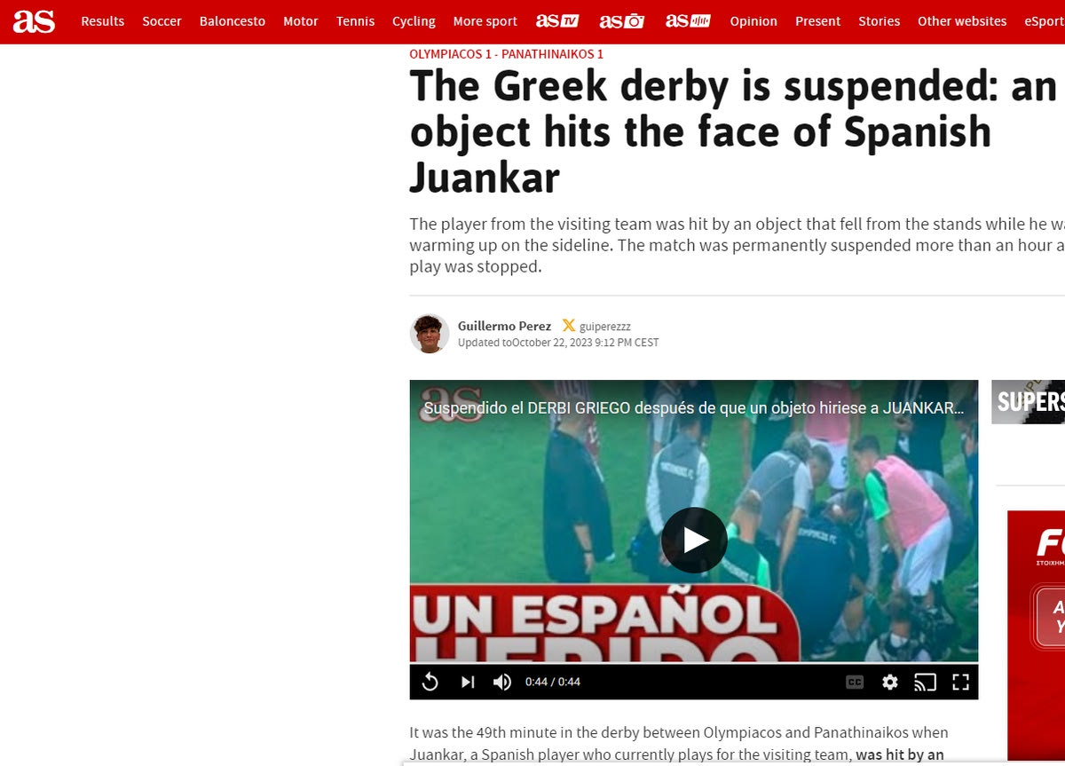 - AS: “Διακόπηκε το ελληνικό ντέρμπι: αντικείμενο χτυπά στο πρόσωπο τον Ισπανό Χουάνκαρ”