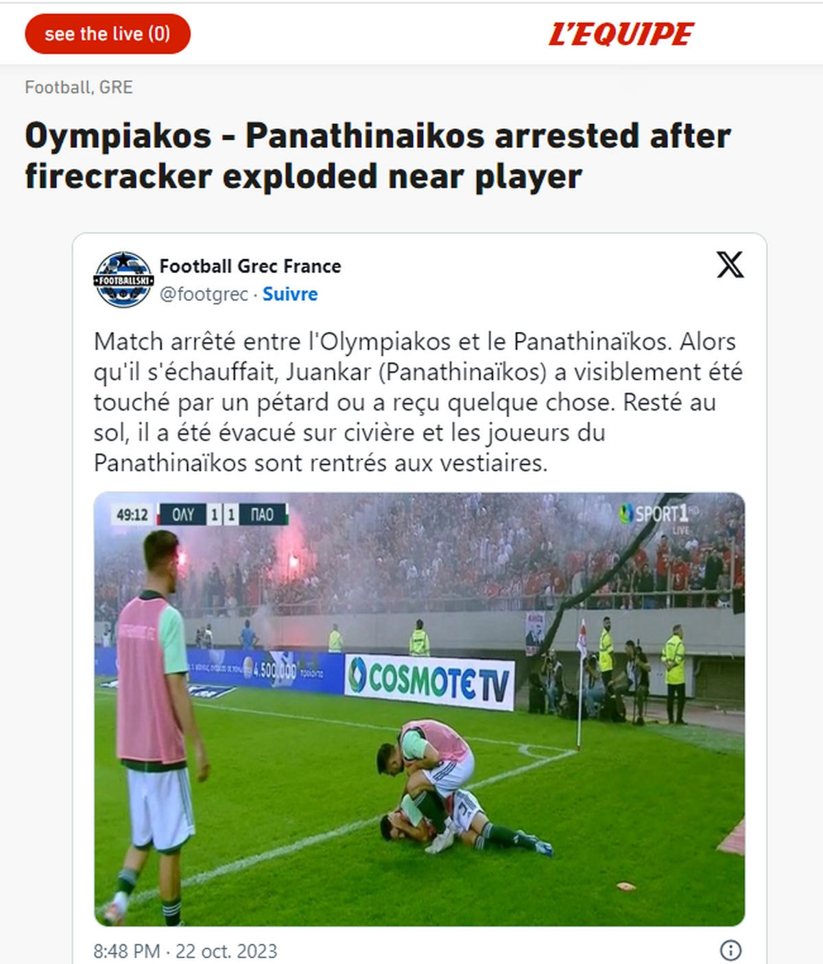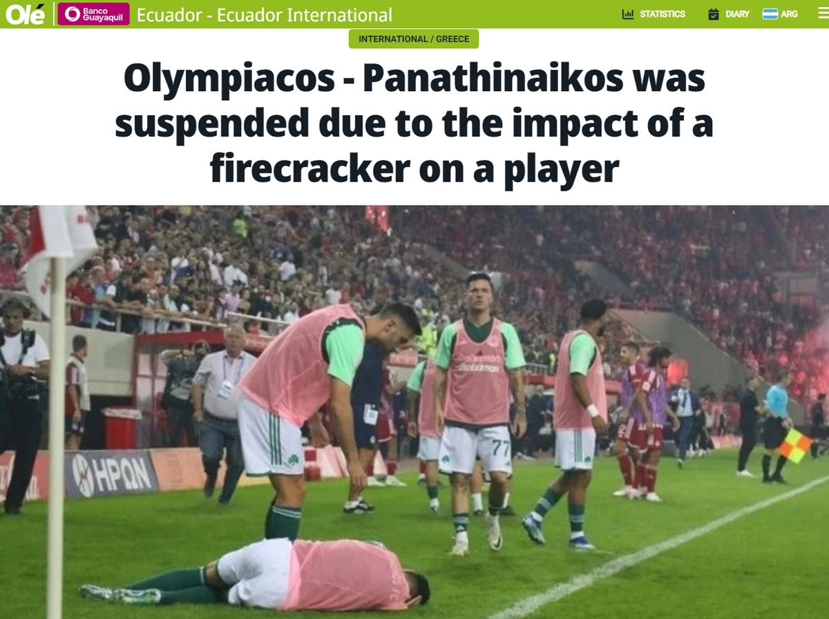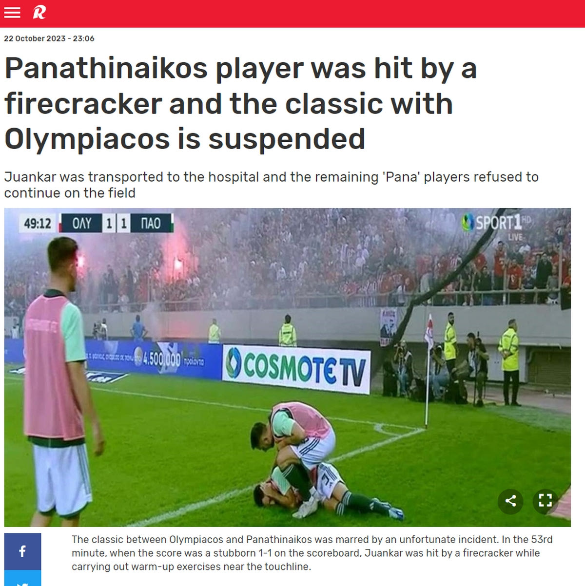 Δείτε πώς αναπαράχθηκε στο εξωτερικό η διακοπή του ντέρμπι Ολυμπιακός - Παναθηναϊκός και τι έγραψε ο ξένος τύπος για τον τραυματισμό του Χουάνκαρ με κροτίδα.