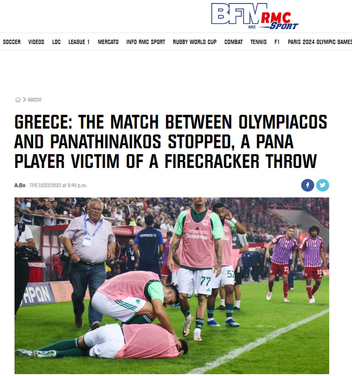 - RMC: “Ελλάδα: Διακόπηκε ο αγώνας Ολυμπιακού – Παναθηναϊκού, παίκτης του Παναθηναϊκού θύμα κροτίδας”