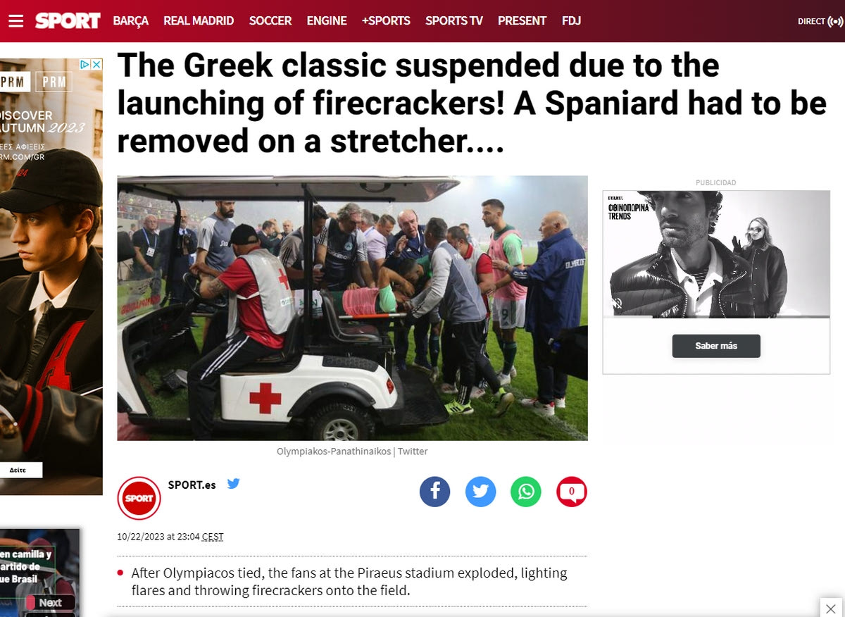 - SPORT: “Το ελληνικό classico διακόπηκε λόγω εκτόξευσης κροτίδων! Ένας Ισπανός έπρεπε να απομακρυνθεί με φορείο”