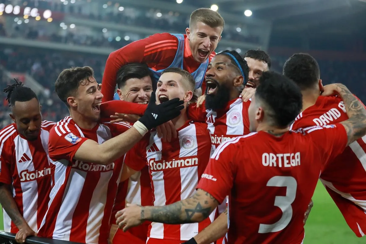 Οι πανηγυρισμοί των παικτών του Ολυμπιακού στο γκολ του Μουζακίτη