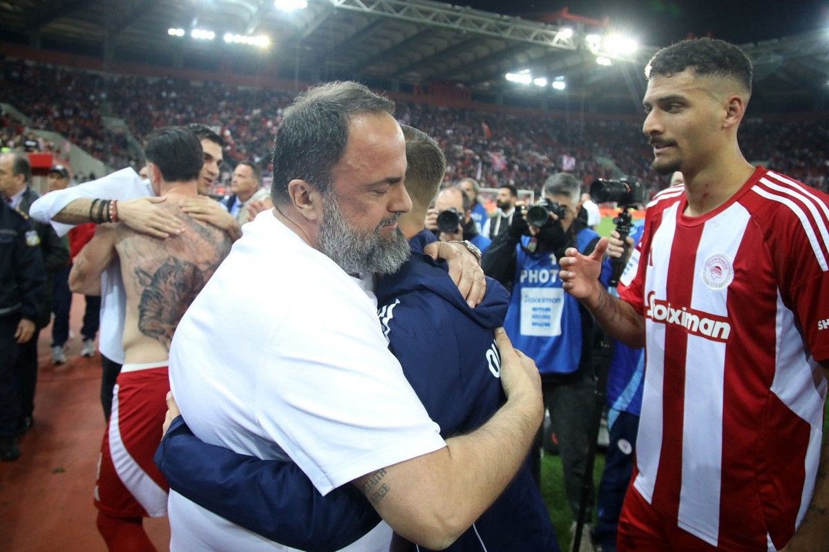 Ο Βαγγέλης Μαρινάκης αγκάλιασε έναν έναν τους ποδοσφαιριστές του Ολυμπιακού αμέσως μετά τη νίκη επί της ΑΕΚ και την κατάκτηση του 48ου πρωταθλήματος της “ερυθρόλευκης” ιστορίας.