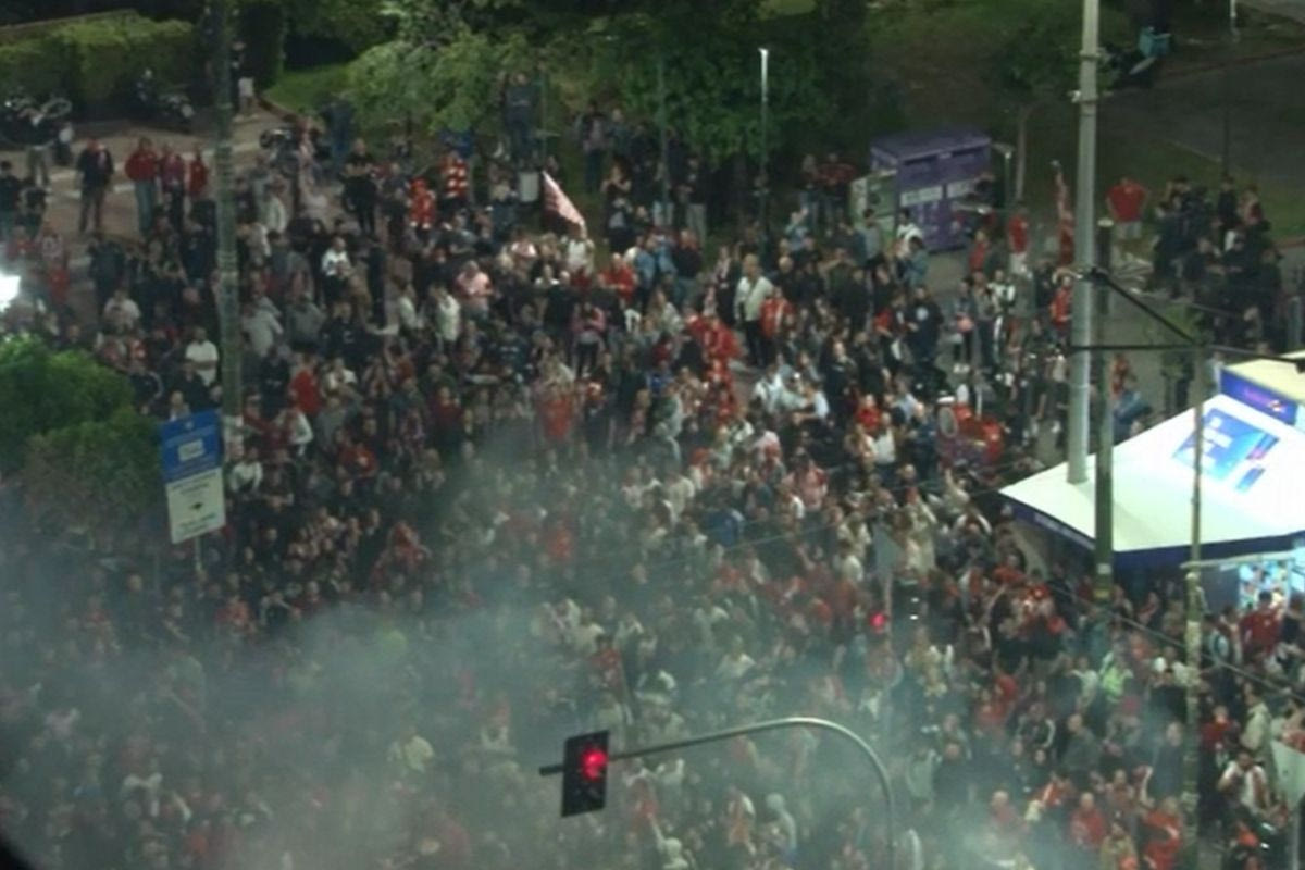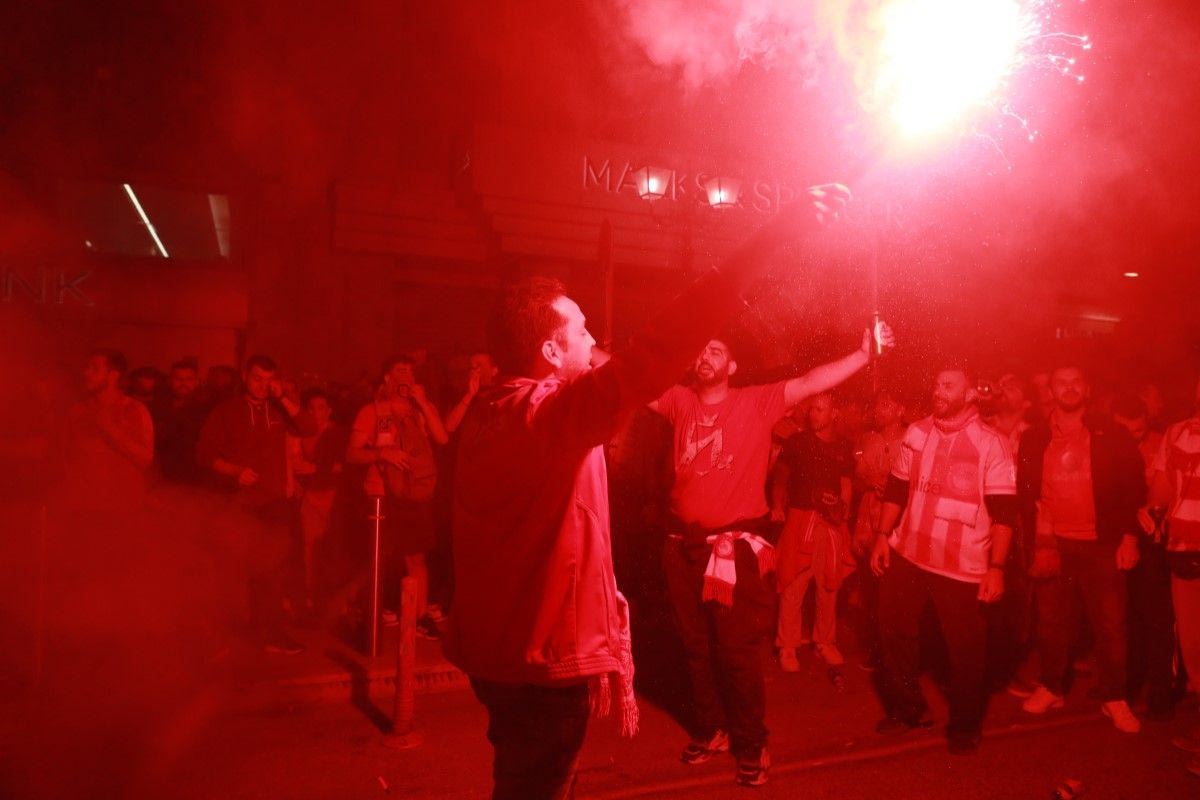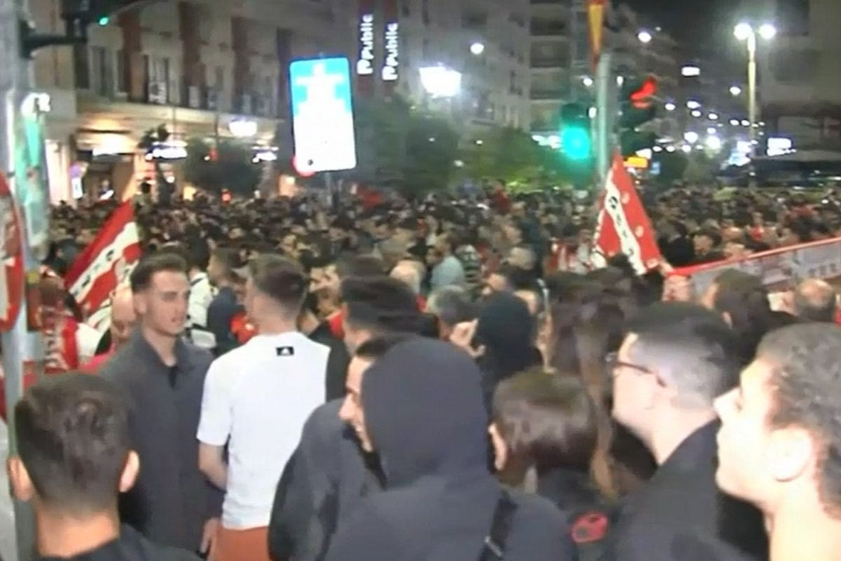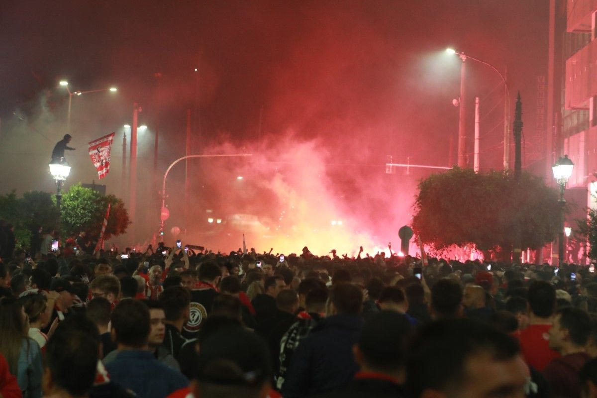 Φίλαθλοι κάθε ηλικίας κατέκλυσαν τον συνήθη τόπο ερυθρόλευκων πανηγυρισμών και με συνθήματα και βεγγαλικά χρωμάτισαν τη γιορτινή ατμόσφαιρα.
