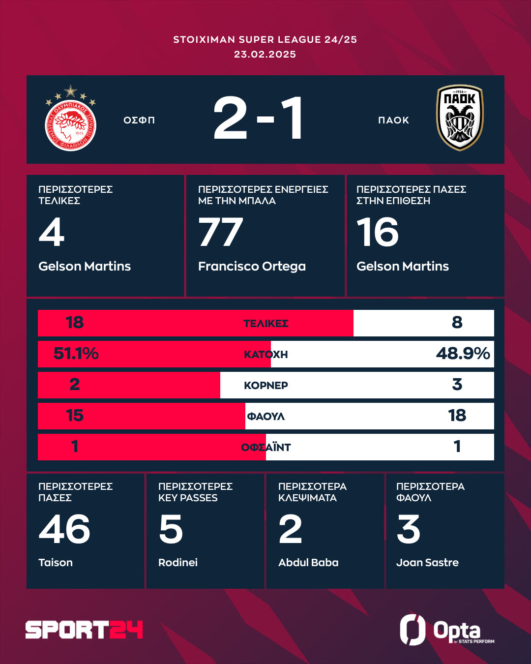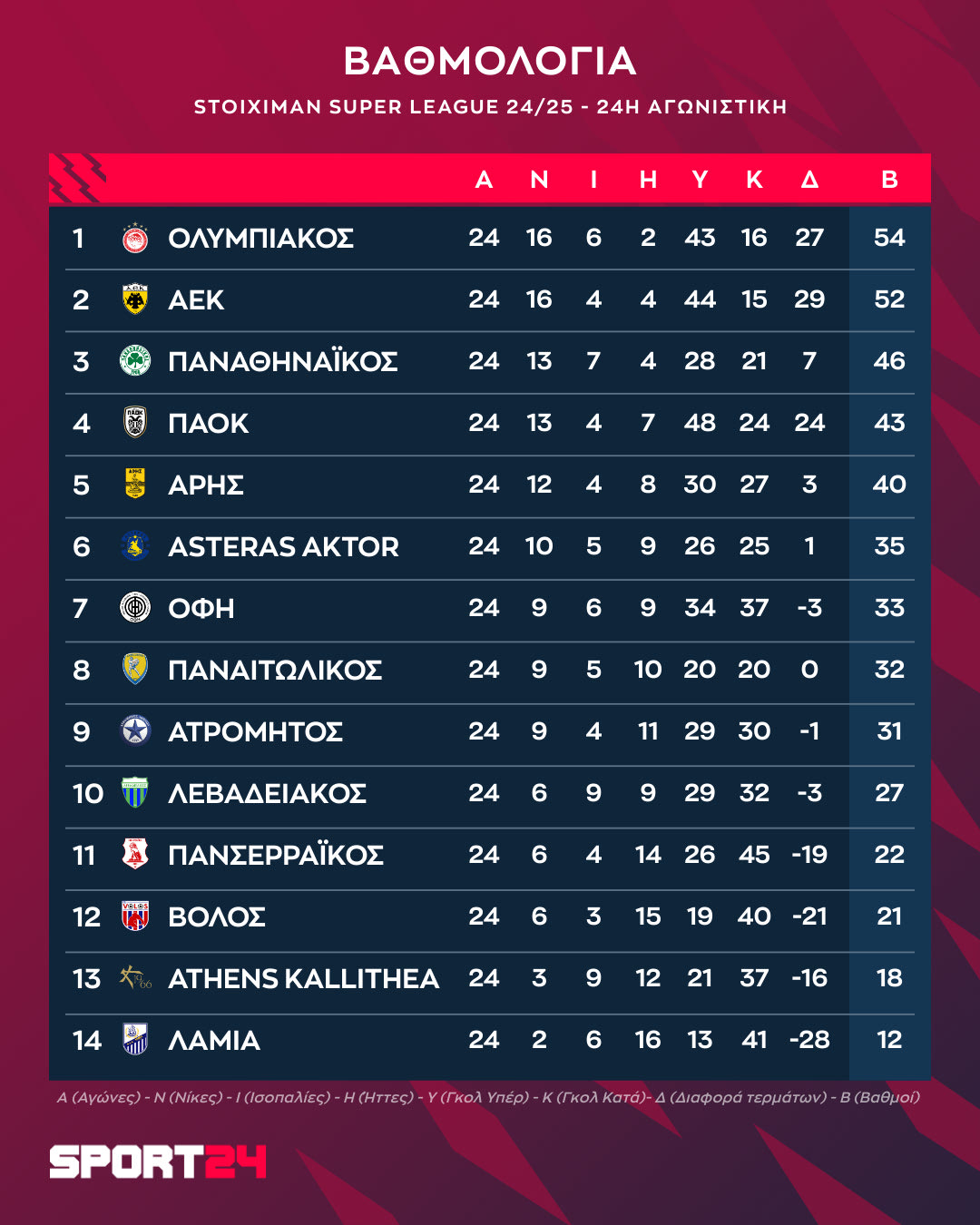 Ο Ολυμπιακός πήρε τρεις πολύτιμους βαθμούς και έφτασε τους 54, δύο περισσότερους από την ΑΕΚ που αντιμετωπίζει την επόμενη εβδομάδα (26/2,20:00). Την ίδια ώρα, ο ΠΑΟΚ πλέον απέχει 11 πόντους από την κορυφή και η πρώτη θέση φαίνεται να απομακρύνεται οριστικά.