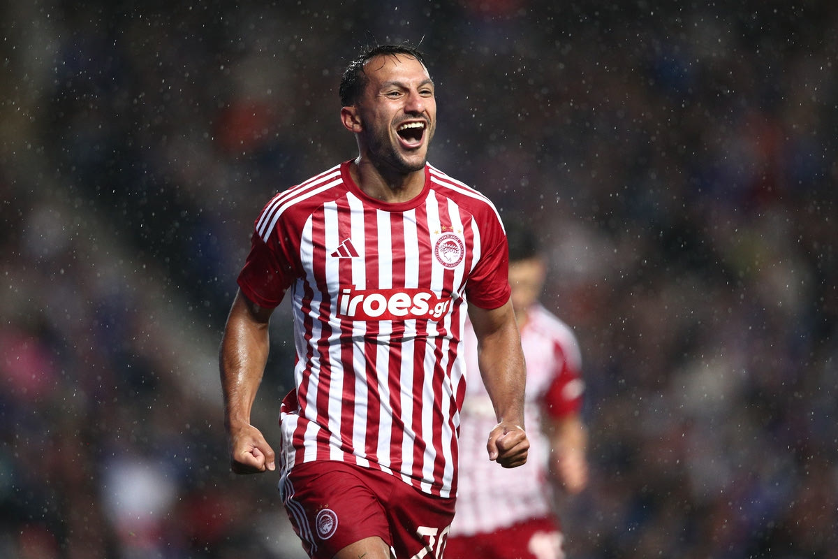 Ο Ζοάο Καρβάλιο πανηγυρίζει γκολ με τη φανέλα του Ολυμπιακού σε φιλική αναμέτρηση κόντρα στην Ρέιντζερς | 26 Ιουλίου 2023