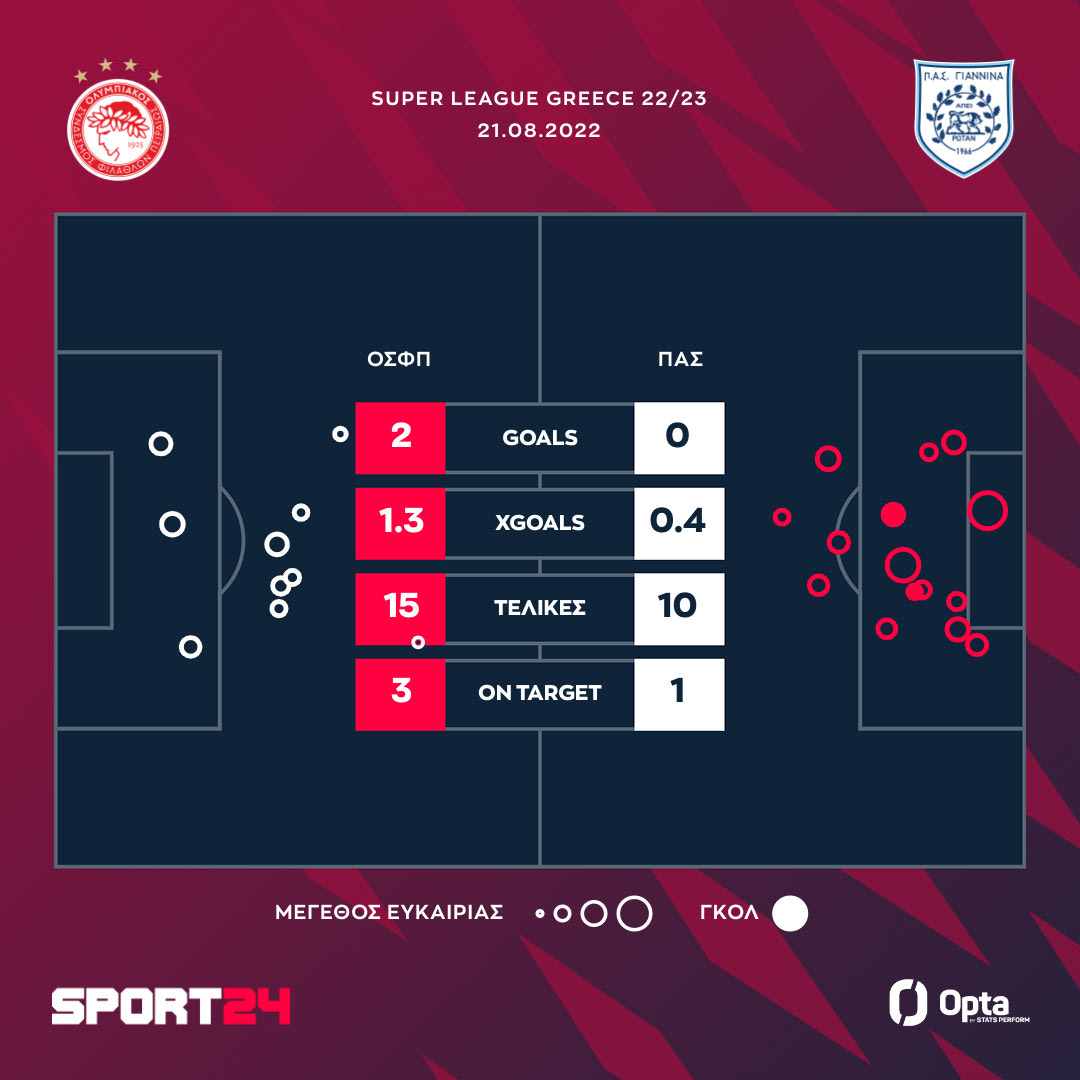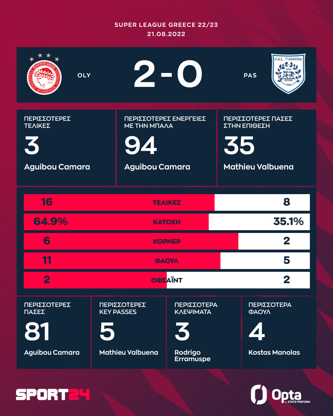 Ο Ολυμπιακός έκανε δυναμικό ξεκίνημα στο νέο πρωτάθλημα της Super League. Οι ερυθρόλευκοι με πειστική εμφάνιση επικράτησαν 2-0 του ΠΑΣ Γιάννινα πανηγυρίζοντας το τρίποντο. Ο εντυπωσιακός Βαλμπουενά άνοιξε το σκορ στο 57ο λεπτό, με τον Λάζαρ Ραντζέλοβιτς να κλειδώνει τη νίκη στο 74′.