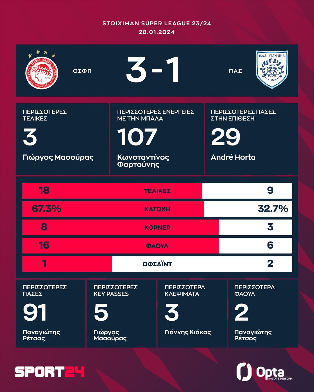 Οι Πειραιώτες “κλείδωσαν” το τρίποντο στο 90+3′. Ο Φορτούνης με ωραία μπαλιά βρήκε τον Μασούρα, ο οποίος από τα δεξιά γύρισε στον Γιόβετιτς που σκόραρε και με τη βοήθεια του δοκαριού. Οι ερυθρόλευκοι αγχώθηκαν, όμως πήραν την τρίτη σερί τους νίκη στη Stoiximan Super League.