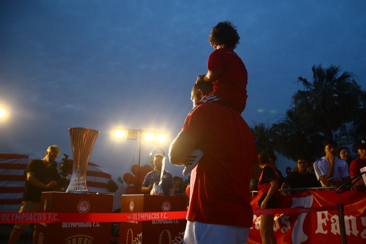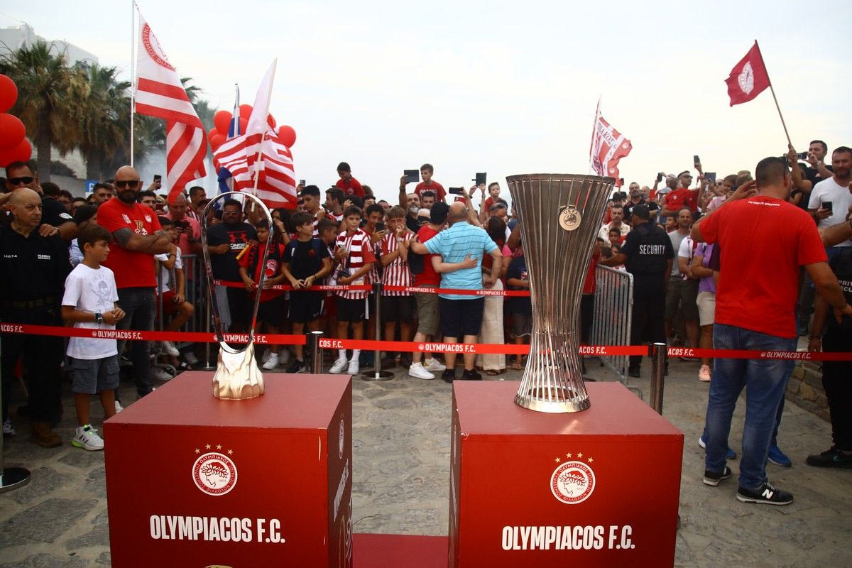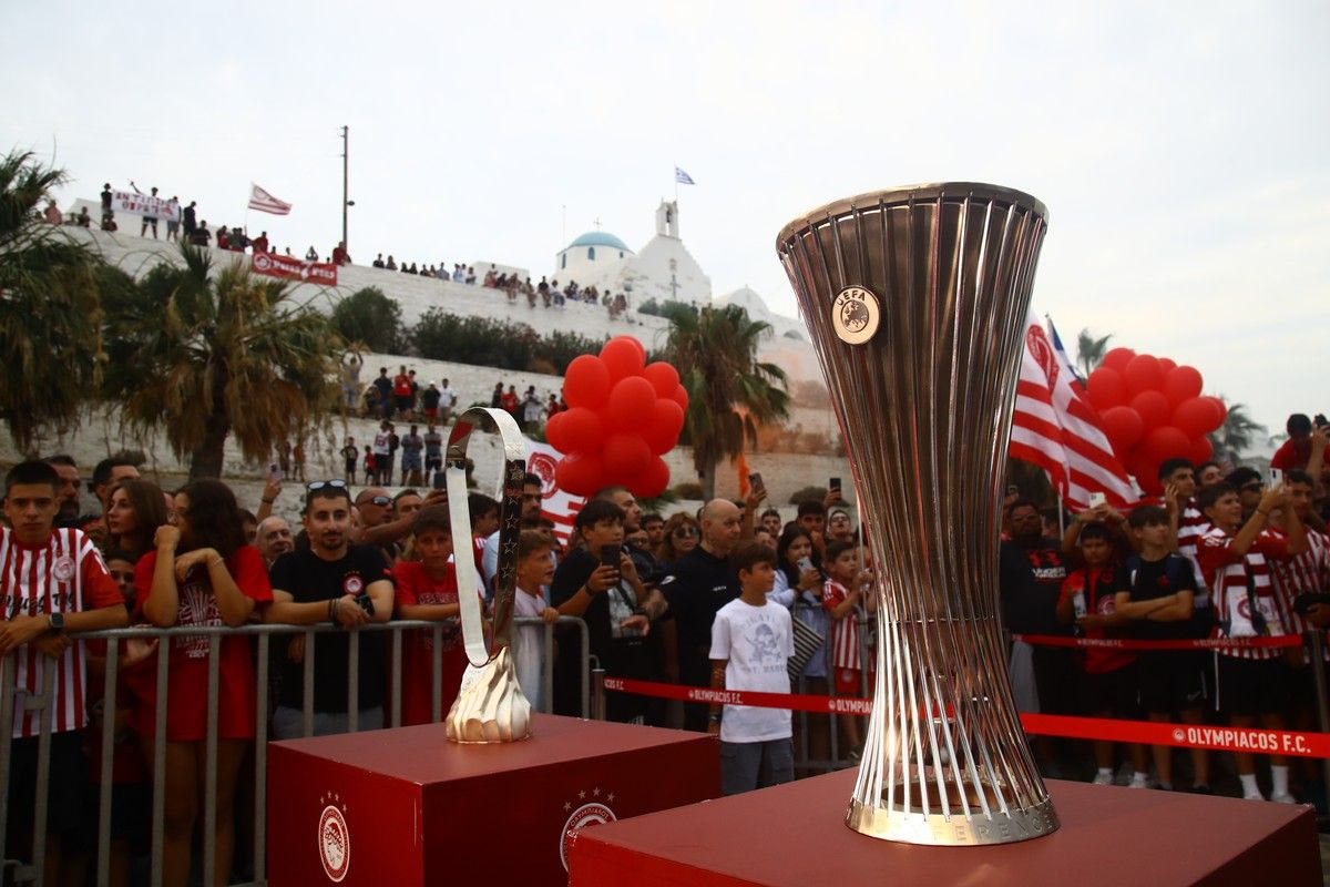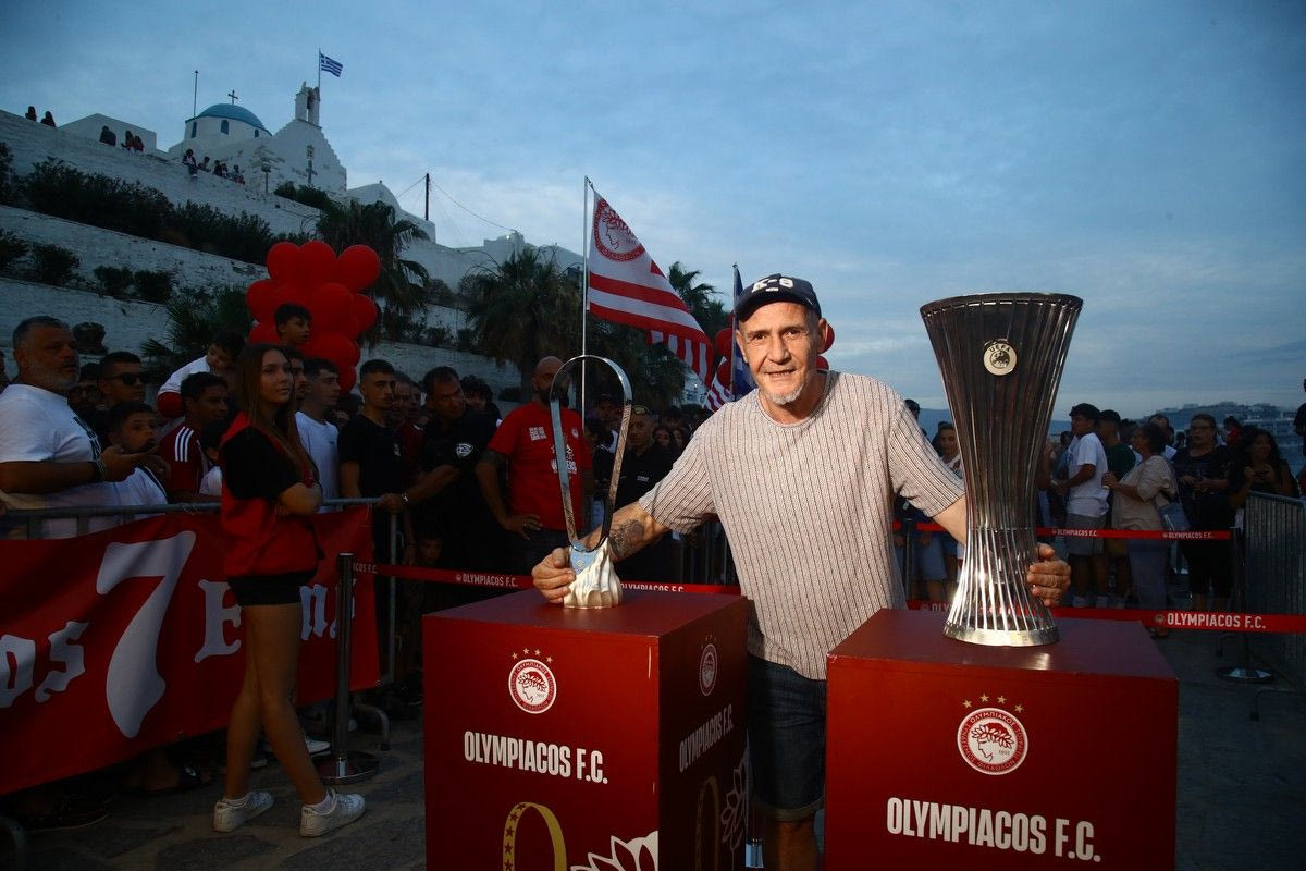 Η Πάρος ήταν ο νέος σταθμός στην περιοδεία του Ολυμπιακού με τα ευρωπαϊκά τρόπαια, με πλήθος ερυθρόλευκων οπαδών να συγκεντρώνονται στο νησί των Κυκλάδων για να τα υποδεχτεί και να βγάζει συλλεκτική φωτογραφία μαζί τους.