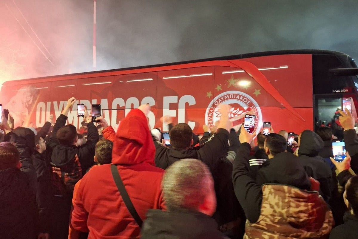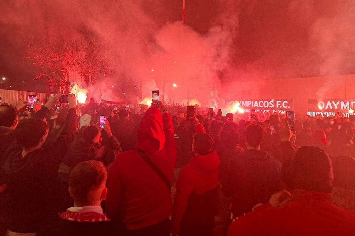 Οι φίλοι του Ολυμπιακού έκαναν χαμό στον Ρέντη και υποδέχθηκαν με καπνογόνα και συνθήματα τον Μεντιλίμπαρ και τους παίκτες του για τη νίκη στην OPAP Arena.