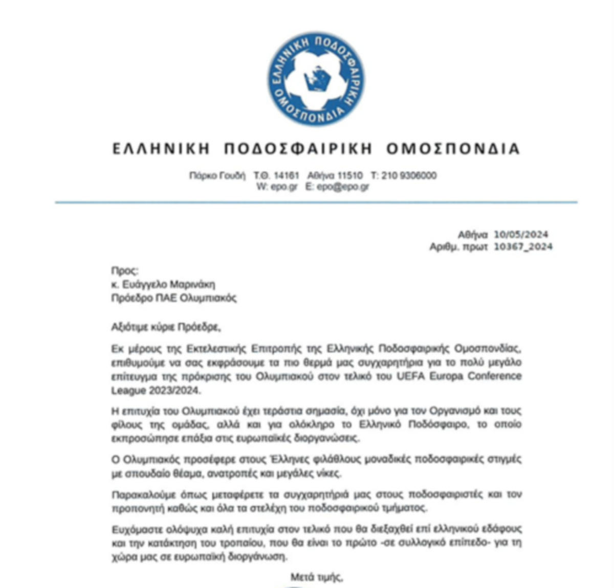 Η ΕΠΟ έδωσε συγχαρητήρια στον Ολυμπιακό για την πρόκριση στον τελικό του Europa Conference League μέσω επιστολής.