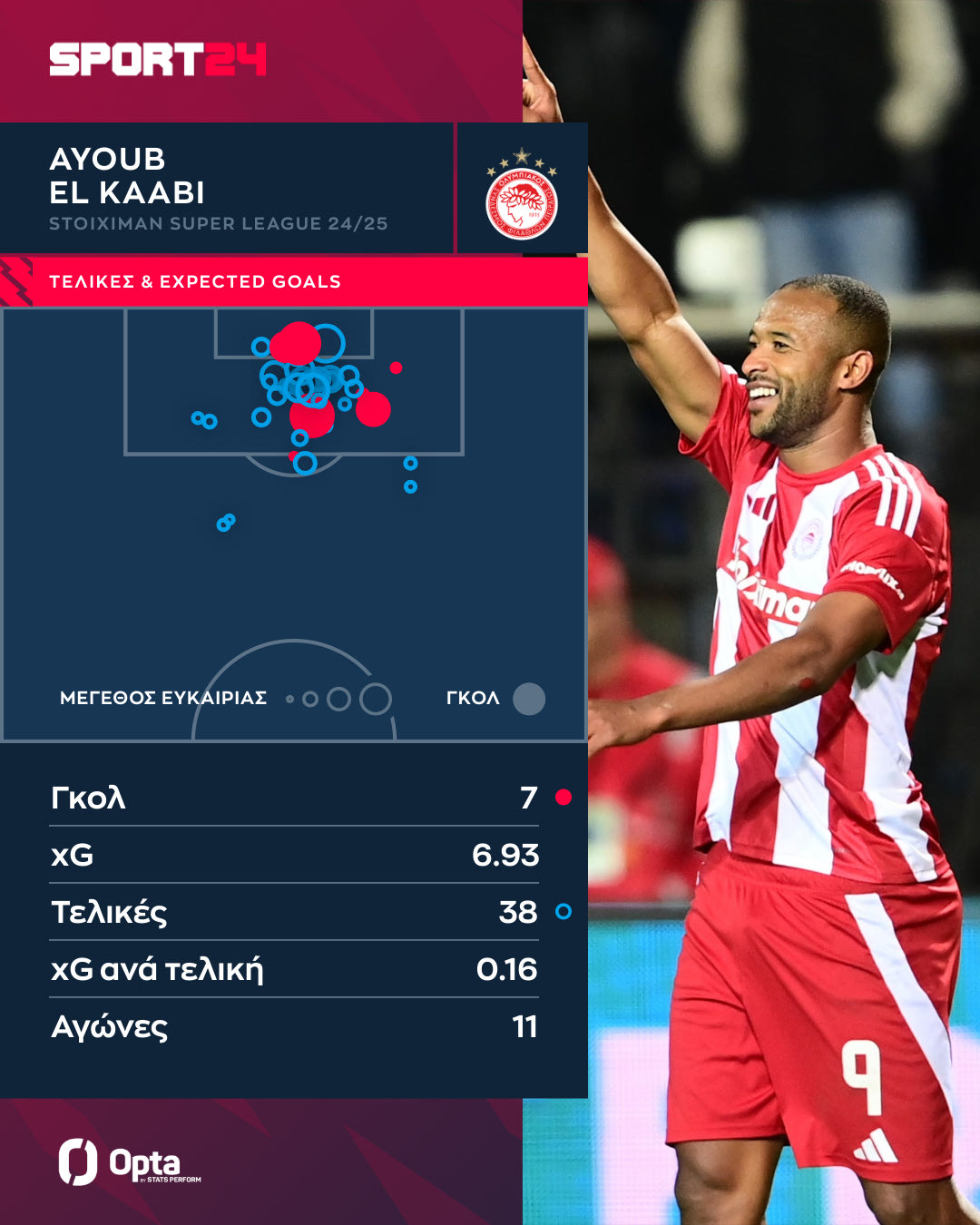 Στο γράφημα της Opta/Stats Perfοrm μπορείτε να δείτε όλες τις τελικές, τα γκολ και τα xGoals του Ελ Κααμπί στα 11 παιχνίδια του στο πρωτάθλημα.