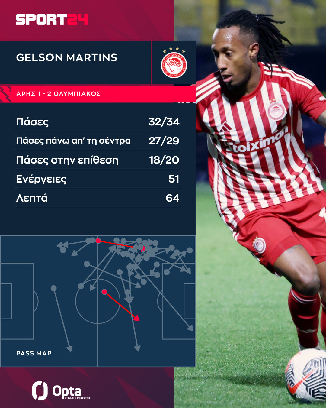 Στο παιχνίδι με τον Άρη χρησιμοποιήθηκε για πρώτη φορά ως βασικός, έπαιξε 64 λεπτά και προσέφερε το πρώτο ασφαλές δείγμα των ικανοτήτων του. Στο γράφημα της Opta/Stats Perform μπορείτε να δείτε τις ενέργειες του Πορτογάλου με την μπάλα.