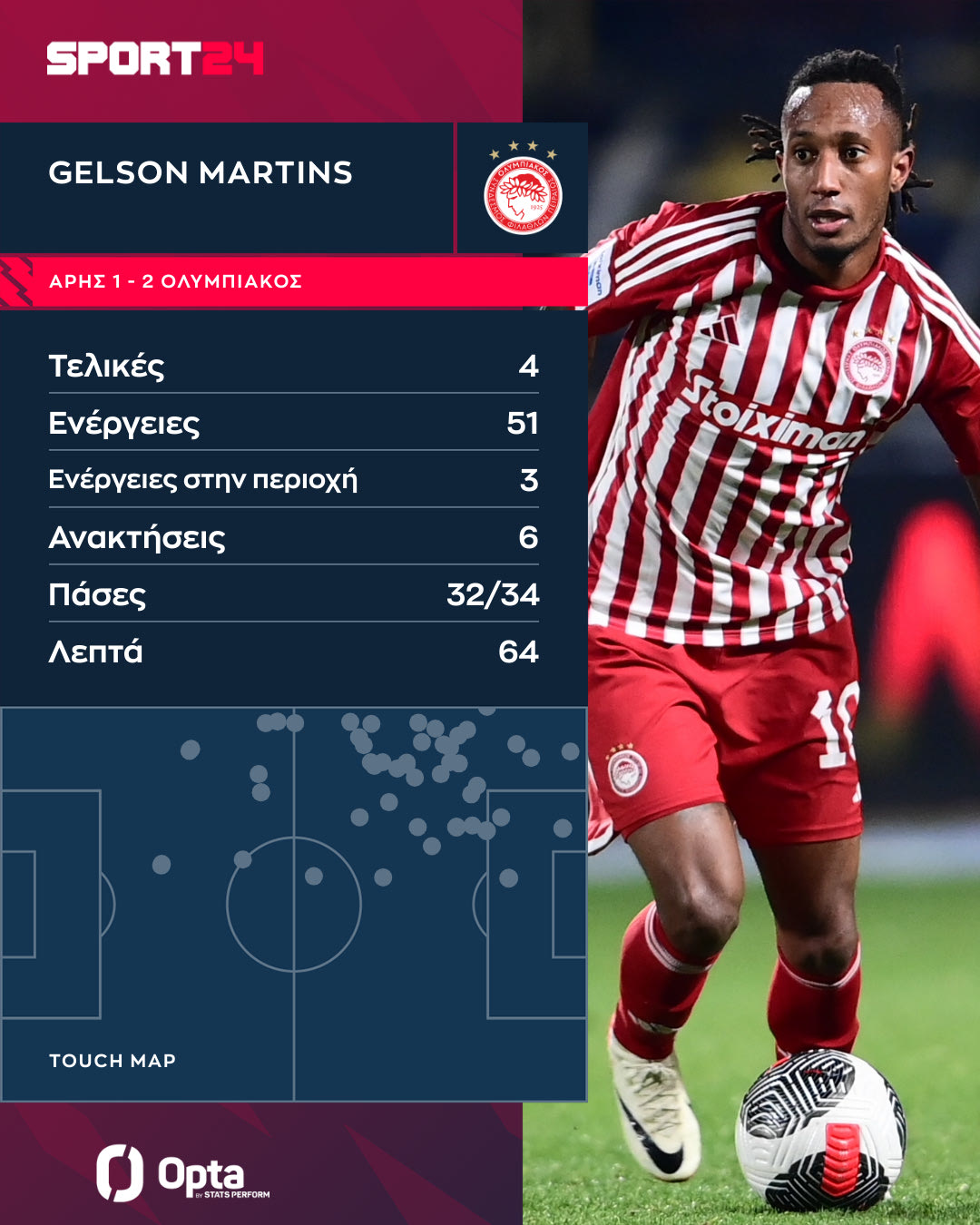 Ο Μαρτίνς κινήθηκε στην αριστερή πτέρυγα, απ’ όπου προσπαθούσε να δημιουργήσει προϋποθέσεις, είτε για τους συμπαίκτες του με μεταβιβάσεις του, είτε για τον ίδιο. Βγήκε από το παιχνίδι στο 64′ έχοντας 51 ενέργειες με την μπάλα. Στο πρώτο μέρος της αναμέτρησης το παιχνίδι του Ολυμπιακού “έγερνε” προς τα δεξιά, ωστόσο στο δεύτερο οι ερυθρόλευκοι κυκλοφόρησαν και από τα αριστερά, με τον Πορτογάλο να αναλαμβάνει πρωτοβουλίες.