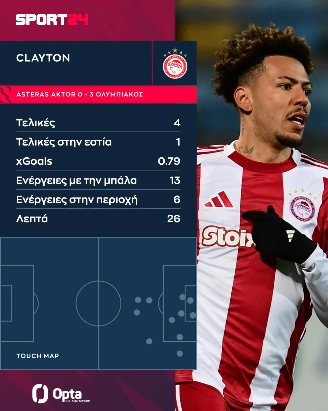 Στο γράφημα της Opta/Stats Perform μπορείτε να δείτε όλες τις ενέργειες, αλλά και τις κορυφαίες επιδόσεις του Κλέιτον στην αναμέτρηση.