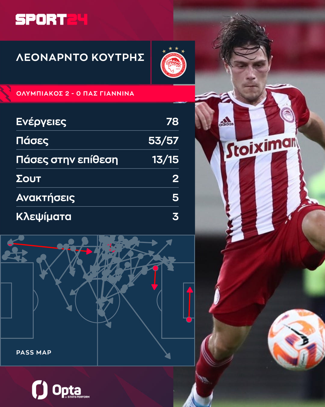 Ο Κούτρης κινήθηκε σε όλη την αριστερή πλευρά, είχε 78 ενέργειες με την μπάλα και ήταν από τους πιο δραστήριους παίκτες του Ολυμπιακού. Μάλιστα, είχε και έξι ενέργειες στην περιοχή των Ηπειρωτών, όπως και δύο τελικές.