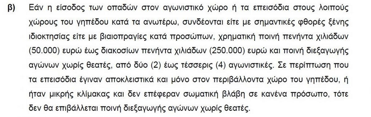 “Εάν η είσοδος των οπαδών στον αγωνιστικό χώρο ή τα επεισόδια στους λοιπούς χώρους του γηπέδου κατά τα ανωτέρω, συνδέονται είτε με σημαντικές φθορές ξένης ιδιοκτησίας είτε με βιαιοπραγίες κατά προσώπων, χρηματική ποινή πενήντα χιλιάδων (50.000) ευρώ έως διακοσίων πενήντα χιλιάδων (250.000) ευρώ και ποινή διεξαγωγής αγώνων χωρίς θεατές, από δύο (2) έως τέσσερις (4) αγωνιστικές.