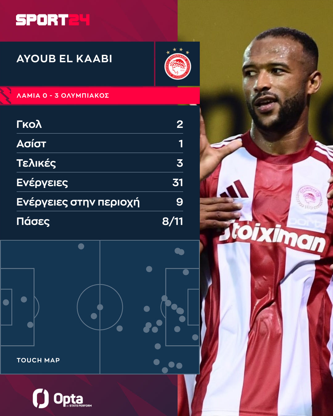 Ο Μαροκινός στράικερ τελείωσε το παιχνίδι με 31 ενέργειες με την μπάλα. Οι εννέα από αυτές ήταν στην περιοχή της Λαμίας, τις περισσότερες από καθένα στον αγωνιστικό χώρο.