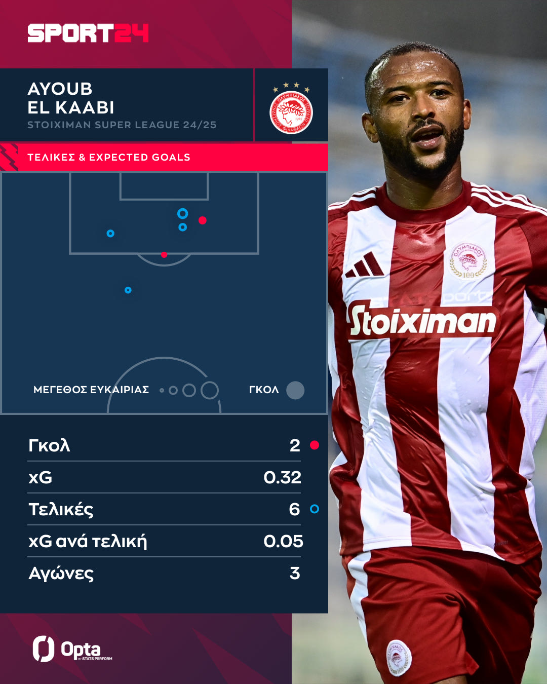 Ο Ελ Κααμπί έχει έξι τελικές μέχρι στιγμής στο πρωτάθλημα. Η αλήθεια είναι πως στα δύο πρώτα ματς (έπαιξε ένα ημίχρονο με τον Βόλο) δεν τροφοδοτήθηκε αρκετά για να απειλήσει. Στο ματς με τη Λαμία είχε τρεις τελικές, ενώ κατάφερε να φτάσει συνολικά τα 0.32xG.