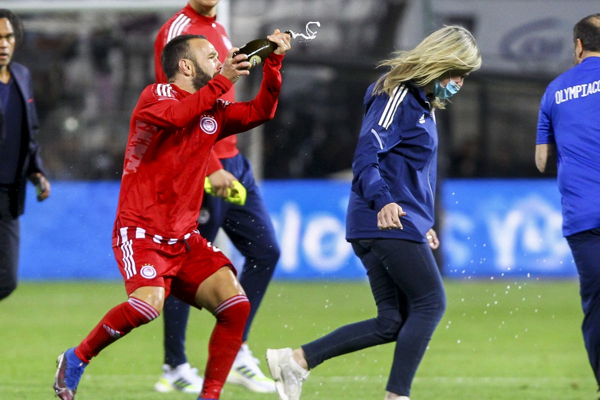 Ο Ματιέ Βαλμπουενά μπουγέλωσε τη μεταφράστρια του Ολυμπιακού, Μαρίνα Τσαλή, κατά τη διάρκεια των πανηγυρισμών για την κατάκτηση της Super League Interwetten.