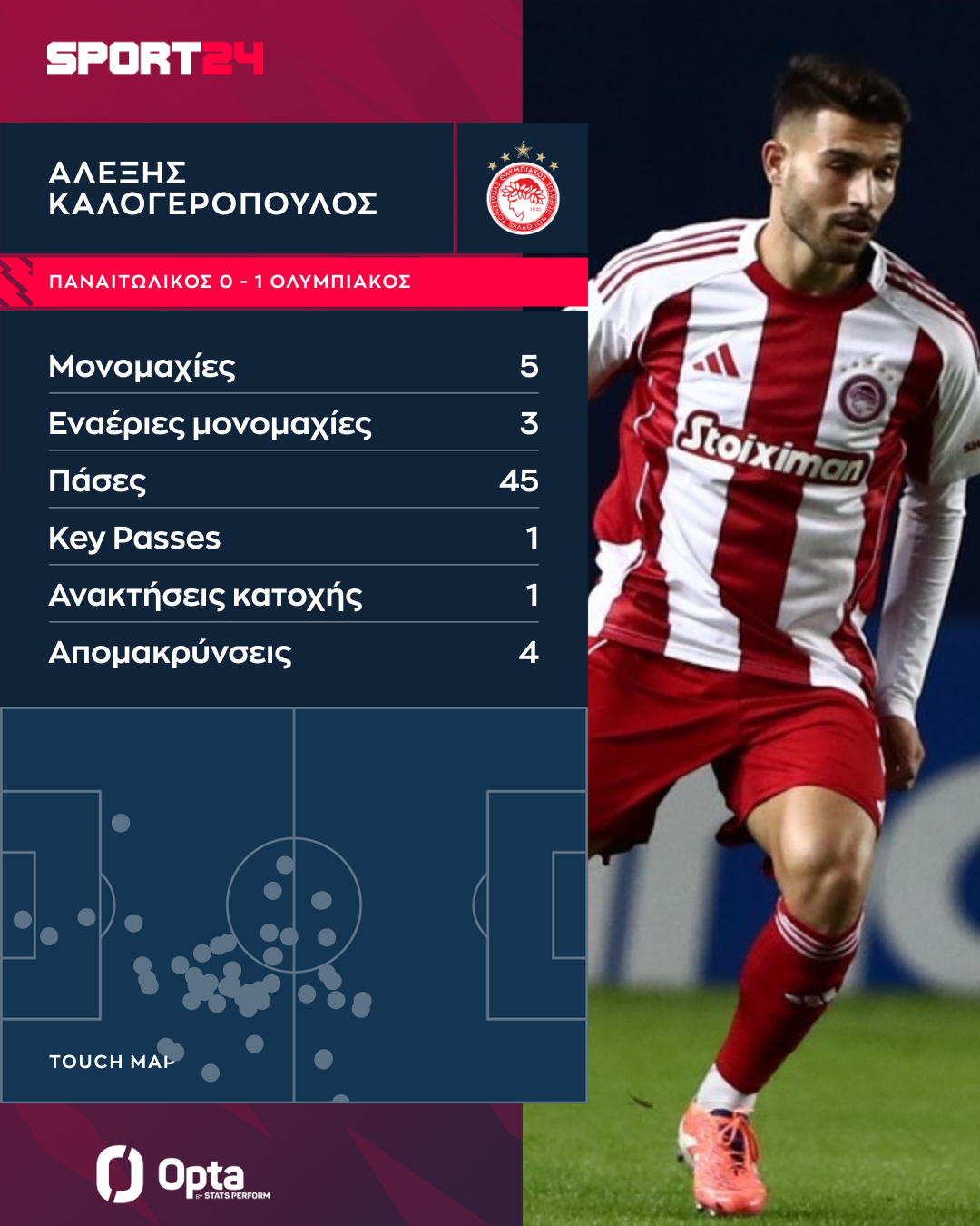 Ο Καλογερόπουλος ήταν ο μοναδικός ποδοσφαιριστής των ερυθρόλευκων που κέρδισε όλες τις μονομαχίες στις οποίες ενεπλάκη. Ο 21χρονος διεθνής στόπερ κέρδισε 5/5 μονομαχίες εδάφους και 3/3 εναέριες μονομαχίες που διεκδίκησε.