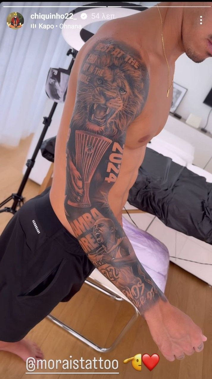 Ο Πορτογάλος μέσος του Ολυμπιακού, Τσικίνιο, "χτύπησε" τατουάζ το τρόπαιο του Conference League μαζί με ένα λιοντάρι.
