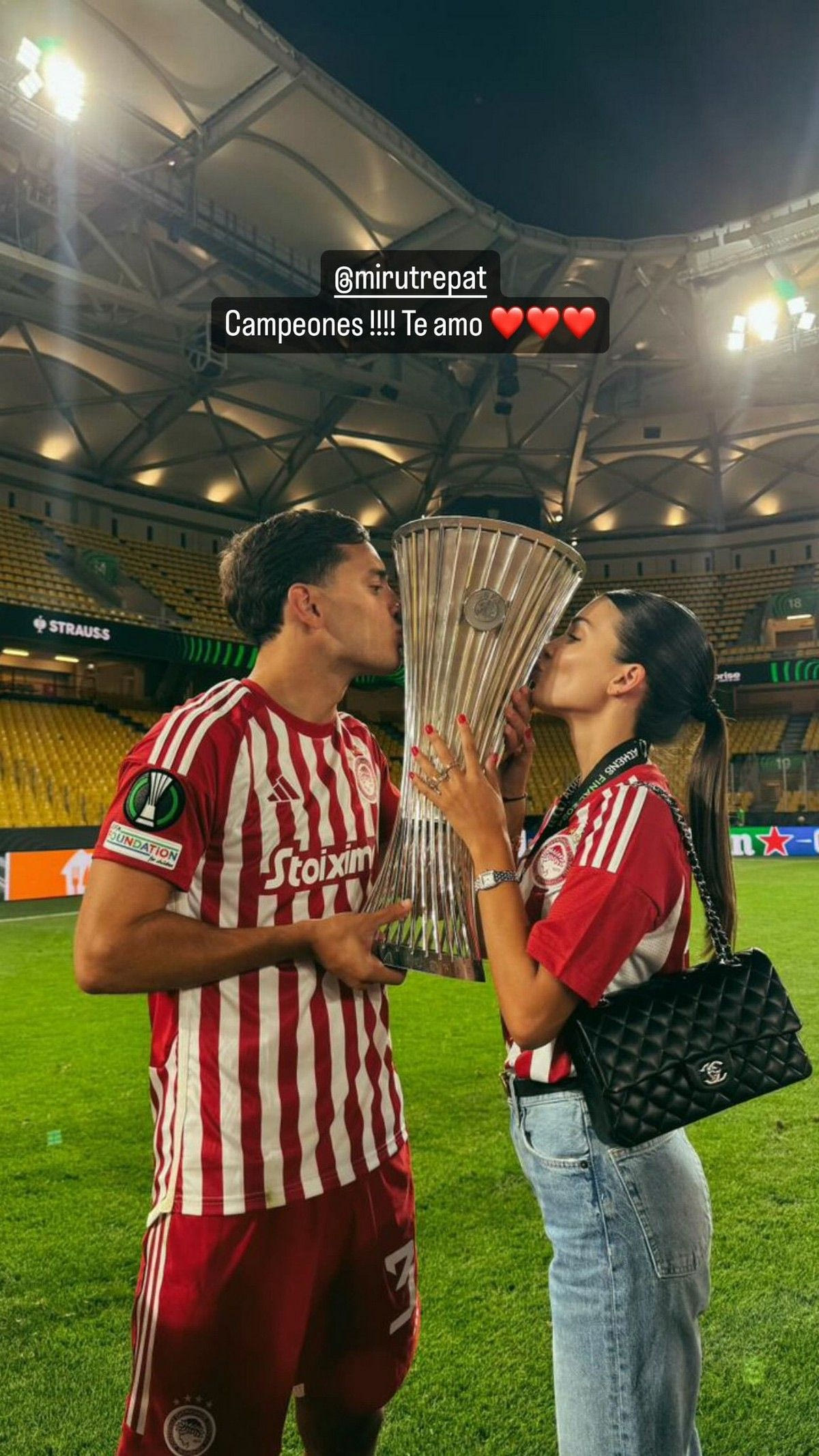 Εμφανώς συγκινημένος ο Σαντιάγκο Έσε μετά την κατάκτηση του Conference League φίλησε την κούπα μαζί με την αγαπημένη του, Μιράντα.