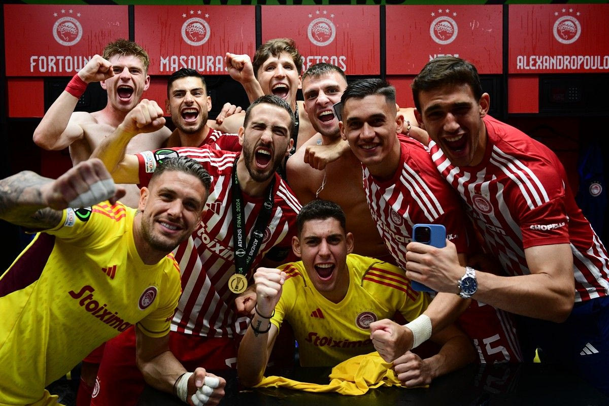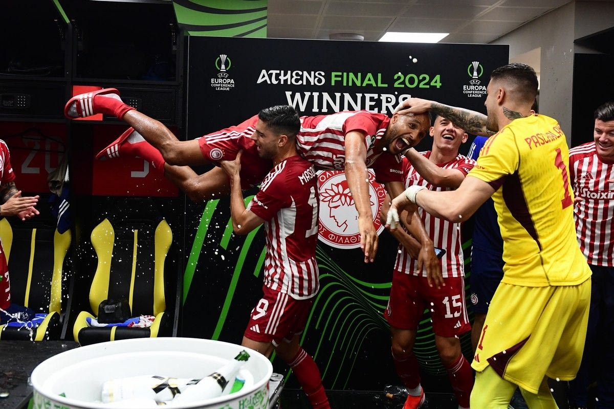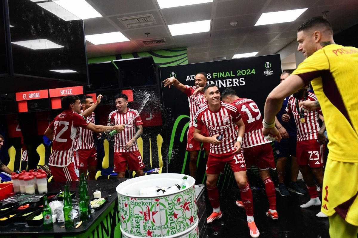 Ο Ολυμπιακός έγραψε χρυσή ιστορία με την κατάκτηση του Conference League και οι παίκτες του έστησαν ένα τρελό πάρτι στα αποδυτήρια της OPAP Arena, γιορτάζοντας για την ανεπανάληπτη επιτυχία.