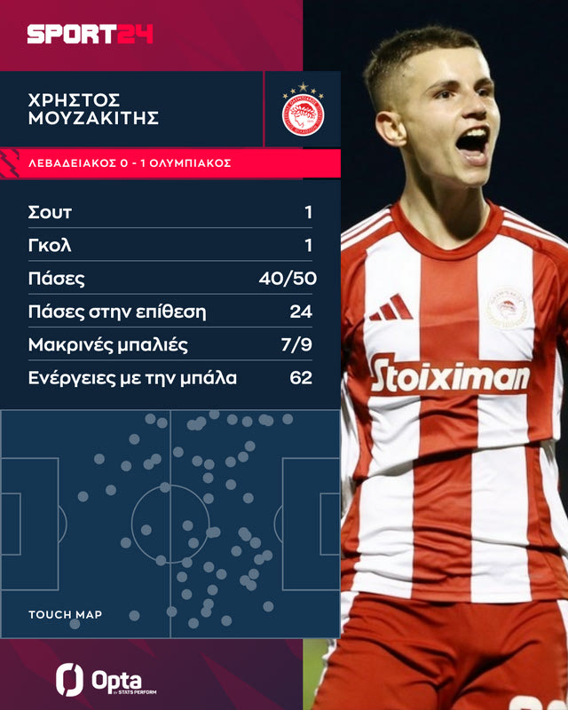 Όπως γίνεται πρόδηλο στο γράφημα της Opta Stats / Perform με τις ενέργειες του Μουζακίτη με την μπάλα, ο 18χρονος χαφ κινήθηκε παντού γύρω από την περιοχή του Λεβαδειακού, πότε αριστερά και πότε δεξιά.