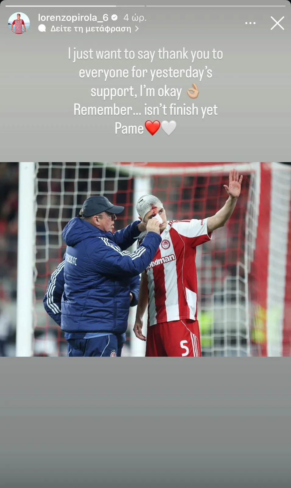Ο Λορέντσο Πιρόλα, μέσω story στο Instagram, ευχαρίστησε άπαντες για τη στήριξη μετά τον τραυματισμό του στο παιχνίδι του Ολυμπιακού με τη Λεβερκούζεν, ενώ έκανε σαφές πως πιστεύει στην ανατροπή.