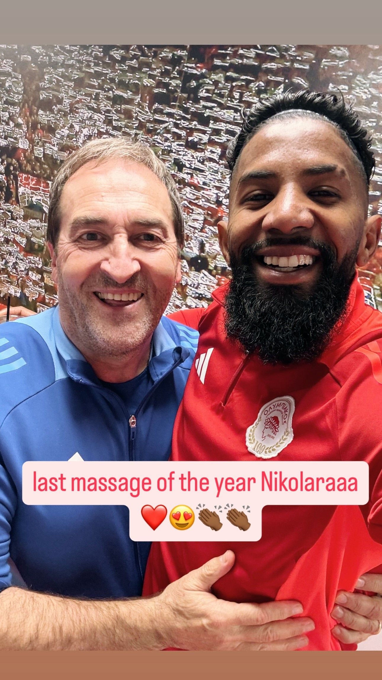 Ο Βραζιλιάνος δεξιός οπισθοφύλακας του Ολυμπιακού έκανε story στο instagram μαζί με τον φυσικοθεραπευτή της ομάδας, Νίκο Λυκουρέση και συνόδευσε τη φωτογραφία με την ατάκα “τελευταίο μασάζ της χρονιάς Νικολάρααα”.
