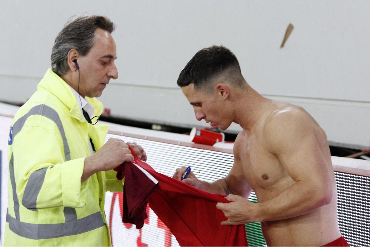 Μετά το τελευταίο σφύριγμα του διαιτητή, ο ποδοσφαιριστής πήγε στην εξέδρα, υπέγραψε το προπονητικό του μπλουζάκι και το έδωσε στον μικρό φίλο της ομάδας.