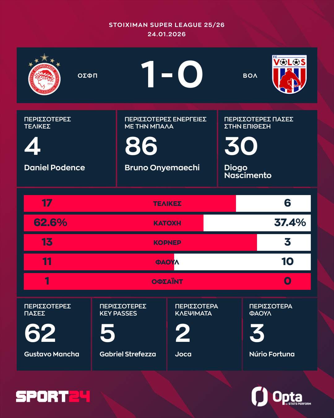Στη βαθμολογία, οι Πειραιώτες έφτασαν τους 42 πόντους και βρέθηκαν στο +1 από τον ΠΑΟΚ. Ο Βόλος έμεινε στους 25 πόντους και παραμένει στην 6η θέση.