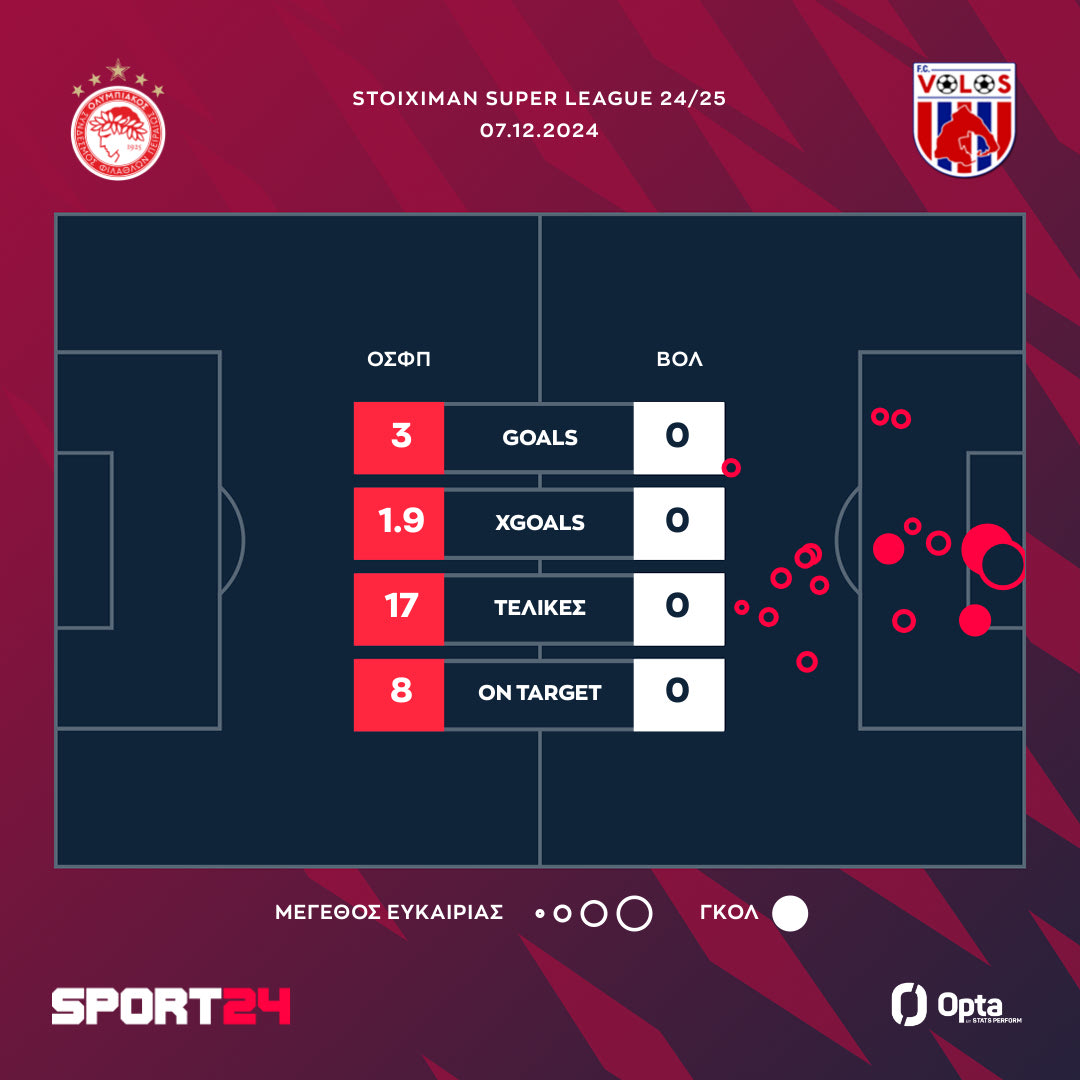 Ο Ολυμπιακός έθεσε τις βάσεις για την πέμπτη σερί νίκη του στο πρωτάθλημα από πολύ νωρίς. Μόλις στο 3ο λεπτό άνοιξε το γκολ ο Αγιούμπ Ελ Κααμπί, ενώ ο Χαράλαμπος Κωστούλας έκανε το 2-0 στο 41ο λεπτό. Το παιχνίδι “καθάρισε” ο Ζέλσον Μαρτρίνς στο 64ο λεπτό δευτερόλεπτα από την είσοδό του στον αγωνιστικό χώρο. Μάλιστα, ο Βόλος ολοκλήρωσε το ματς, χωρίς να έχει τελική.