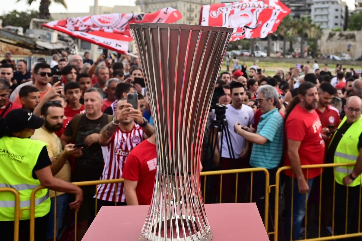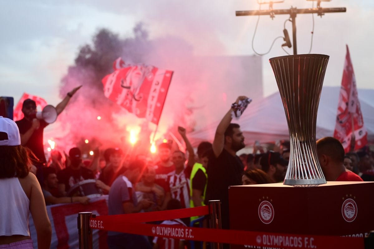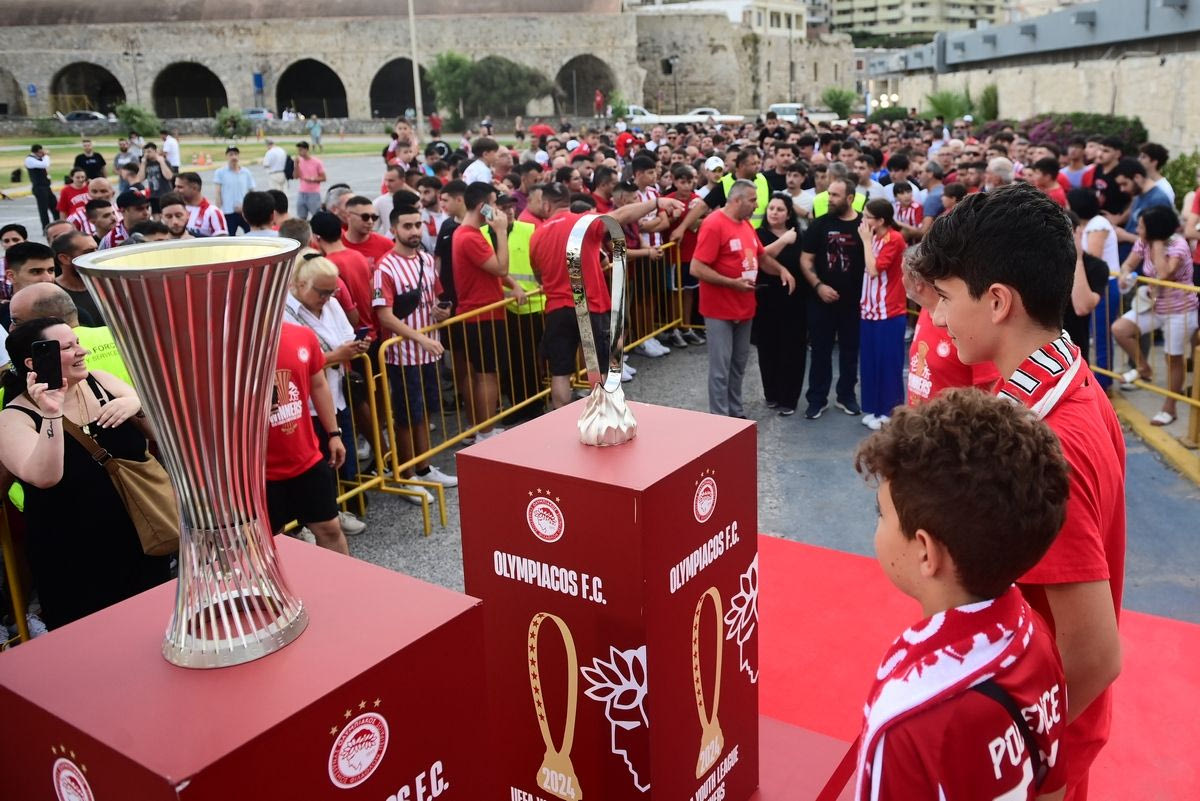 Πλήθος κόσμου βρέθηκε και στο Ηράκλειο για να δει από κοντά τις ευρωπαϊκές κούπες του Ολυμπιακού, το τρόπαιο του Conference League και του Youth League.