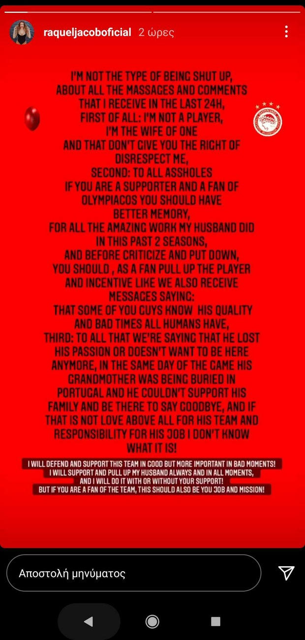 “Δεν είναι ο τύπος μου να σκάω με όλα αυτά τα μηνύματα και τα σχόλια που έλαβα τα τελευταία 24ωρα. Πρώτα απ’ όλα δεν είμαι ποδοσφαιριστής, αλλά σύζυγος και δεν δίνω να δικαίωμα να μην με σέβεστε. Δεύτερον, αν στηρίζετε τον Ολυμπιακό πρέπει να έχετε καλύτερη μνήμη για όλη την καταπληκτική δουλειά που κάνει ο σύζυγός μου τις δύο τελευταίες σεζόν.