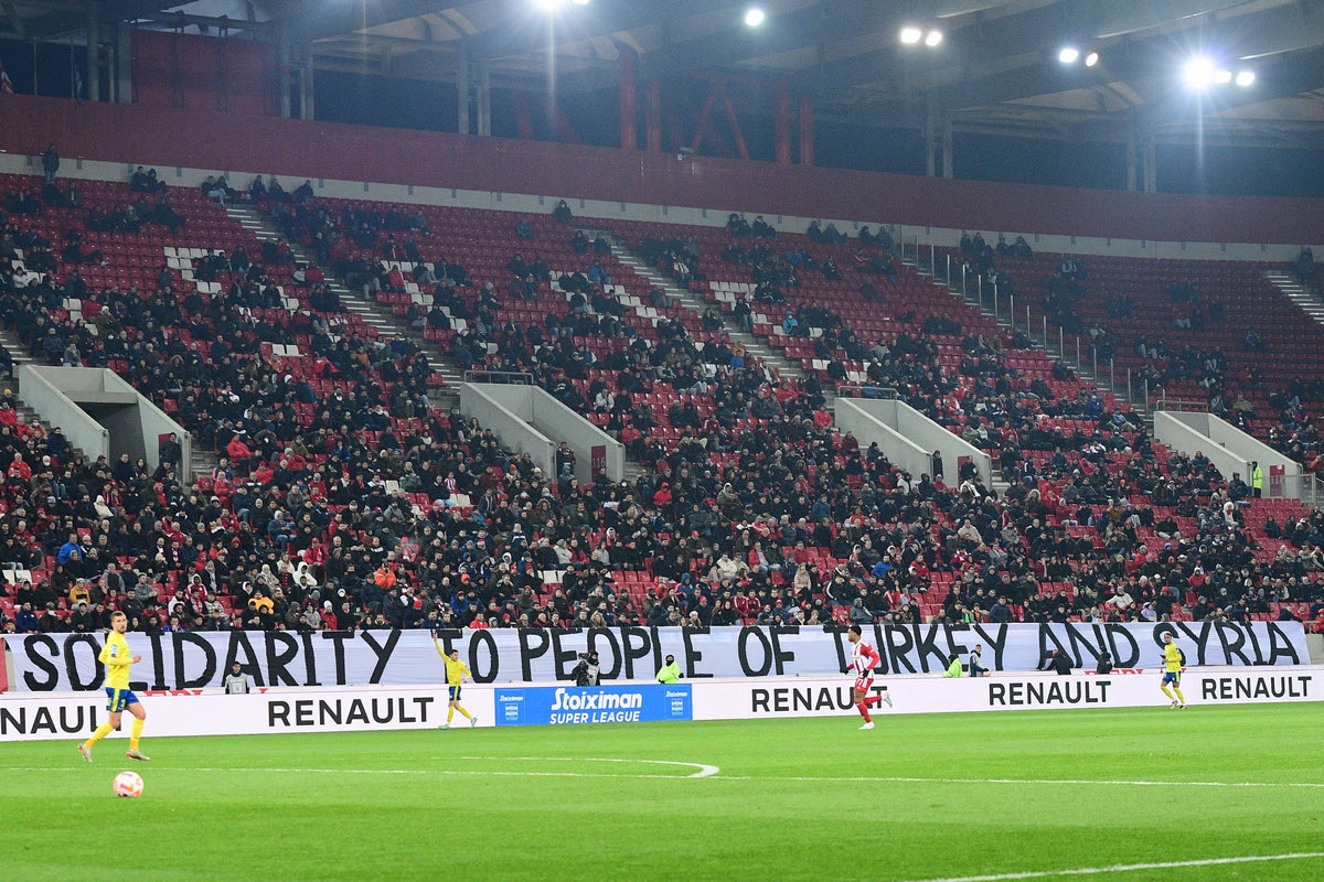Ολυμπιακός – Παναιτωλικός: Πανό συμπαράστασης για το λαό της Τουρκίας και της Συρίας στις εξέδρες του “Καραϊσκάκης”