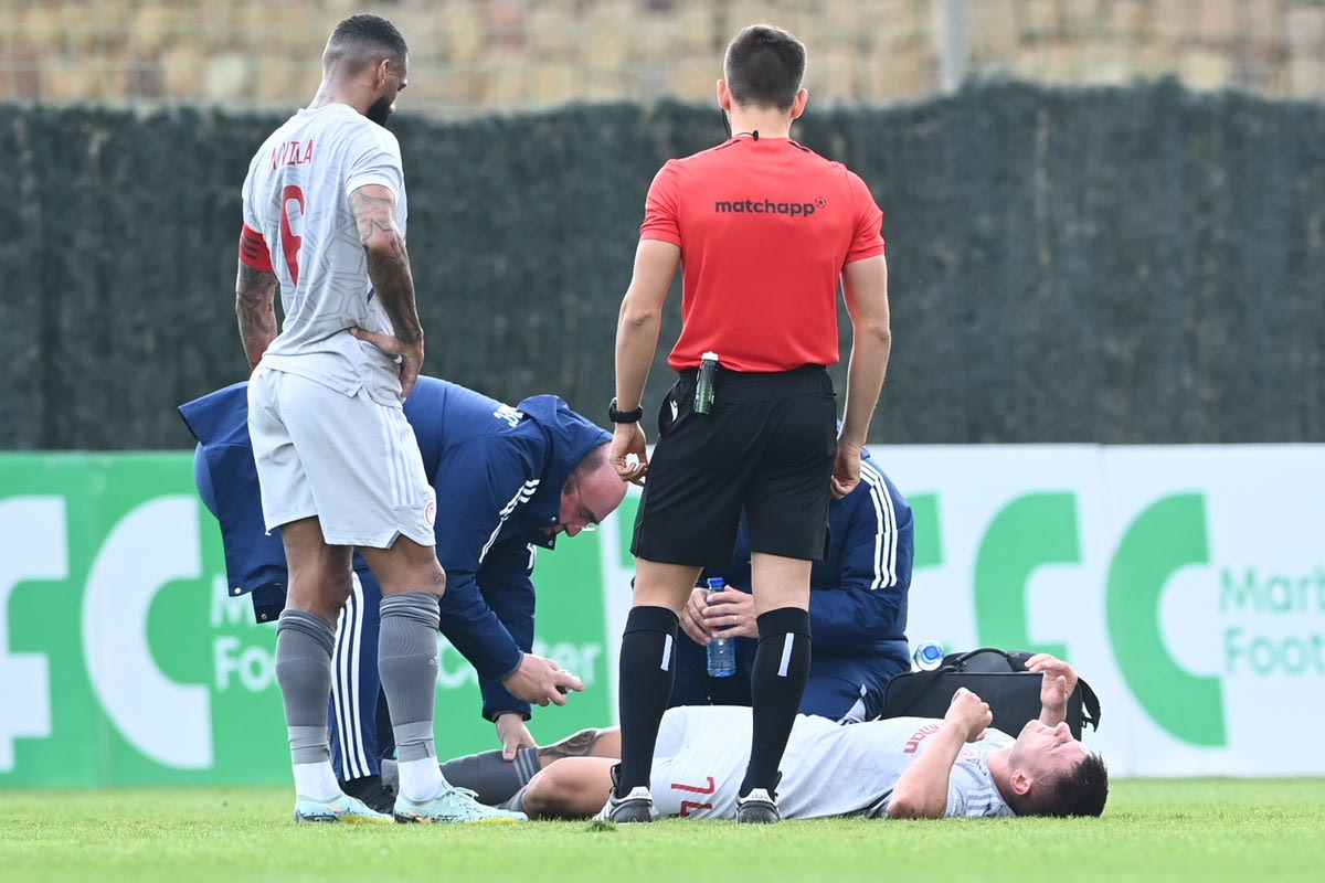 Ο αμυντικός των ερυθρόλευκων έπεσε στο έδαφος με πόνο στο δεξί πόδι. Αφού δέχθηκε τις πρώτες βοήθειες, σηκώθηκε κουτσαίνοντας και ο Μπουχαλάκης τον αντικατέστησε πριν από τη λήξη του πρώτου μέρους.